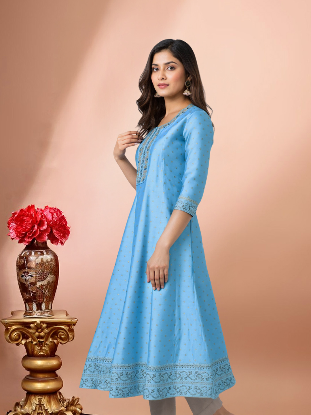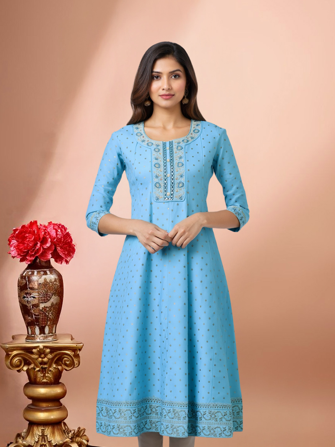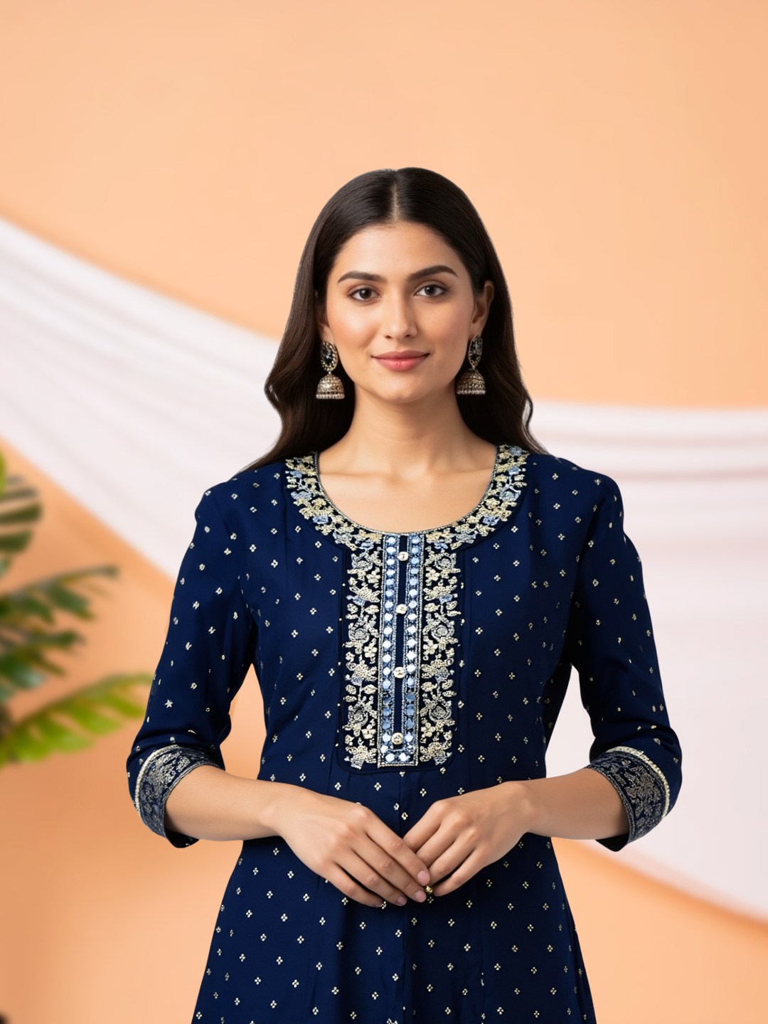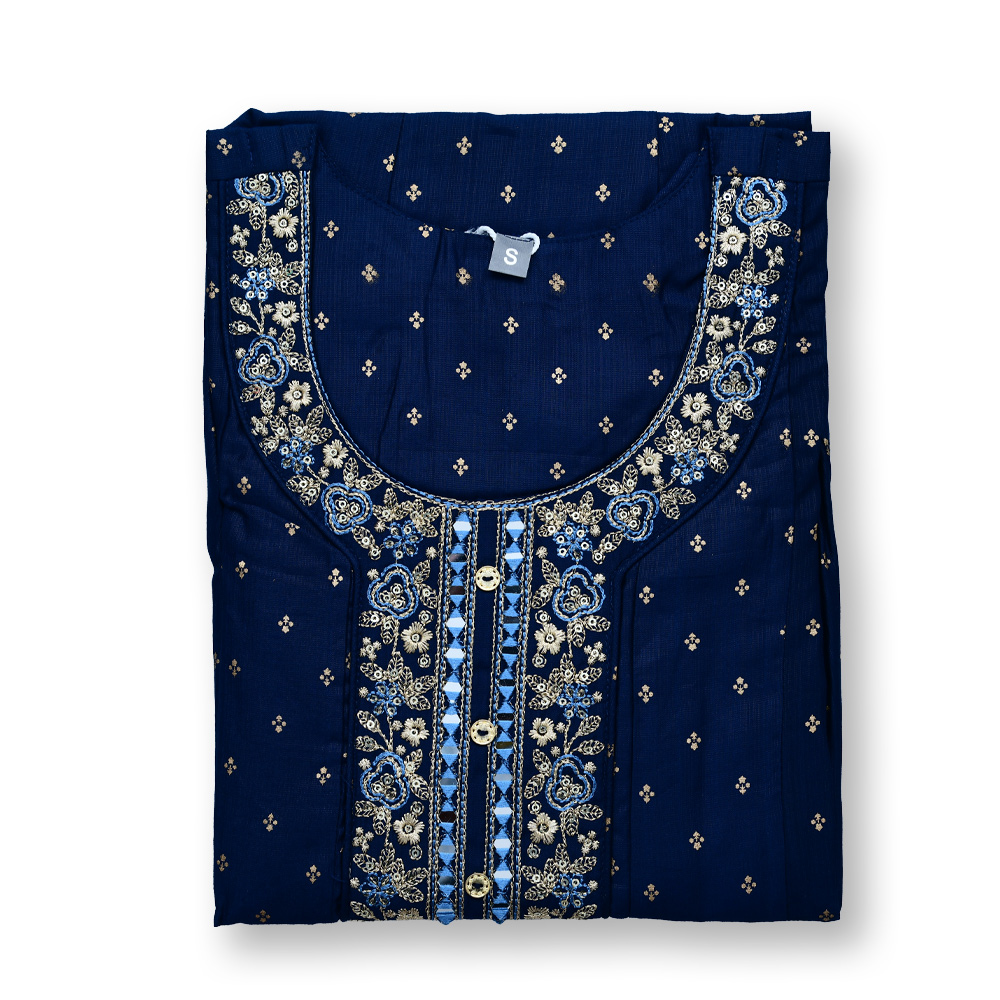 This Anarkali kurta brings together comfort and elegance in perfect harmony. Designed with a round neck featuring exquisite embroidered accents, it is further enhanced by sequin and mirror work for a subtle festive glow. The embroidered three-quarter sleeves add depth, while the breathable fabric ensures all-day comfort with a graceful drape.