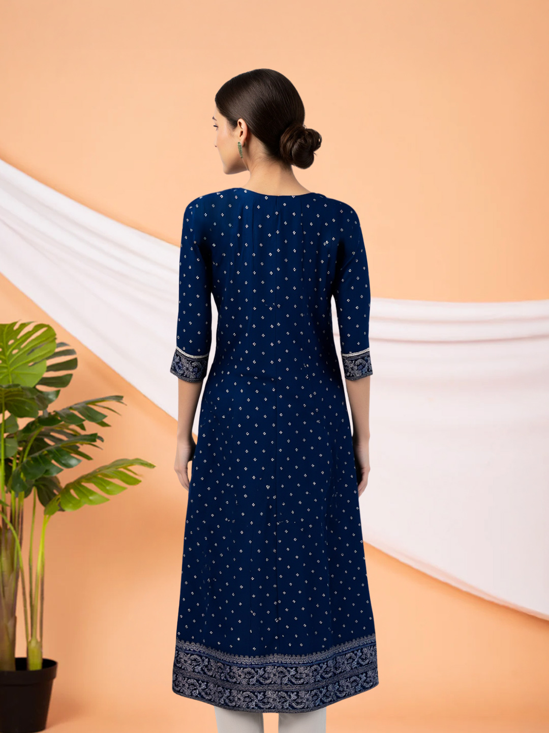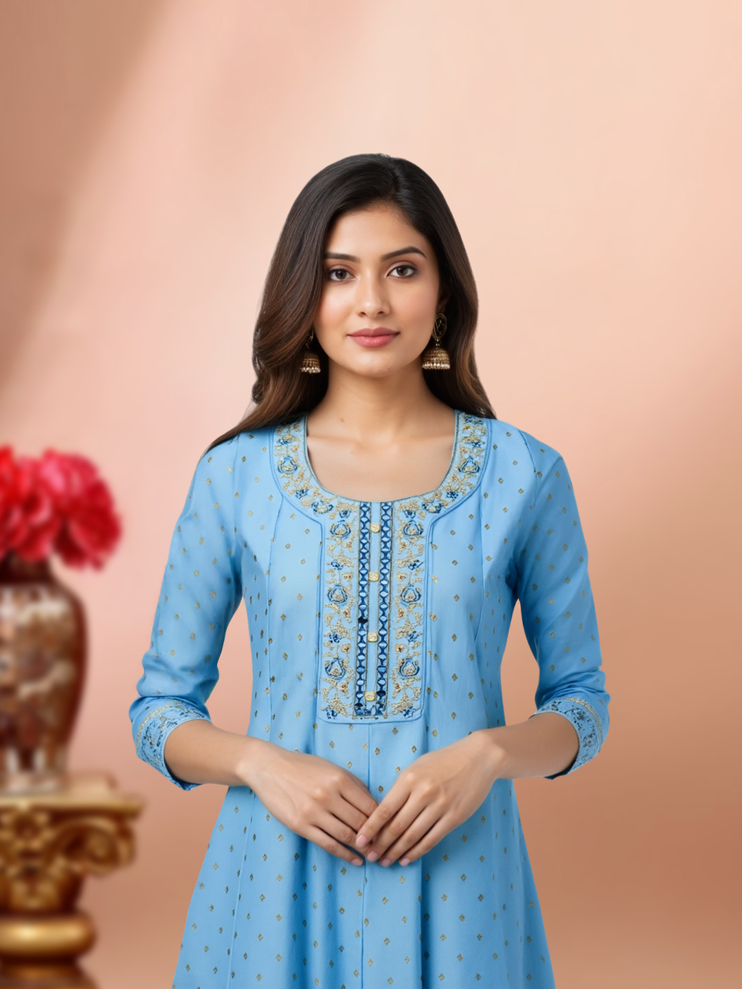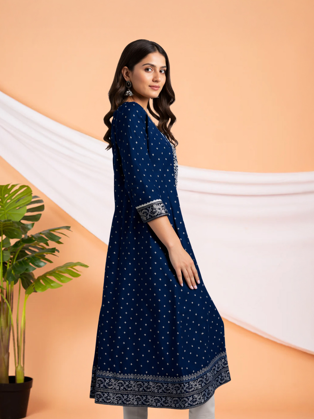 This Anarkali kurta brings together comfort and elegance in perfect harmony. Designed with a round neck featuring exquisite embroidered accents, it is further enhanced by sequin and mirror work for a subtle festive glow. The embroidered three-quarter sleeves add depth, while the breathable fabric ensures all-day comfort with a graceful drape.
