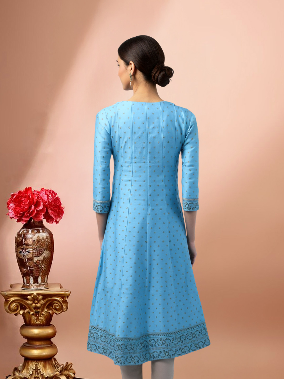 The Sequin Embellished Mirror Work Anarkali Kurta is designed to make a lasting impression. Featuring a round neckline with intricate embroidered detailing, this kurta reflects refined craftsmanship. The three-quarter sleeves with embroidered cuffs add a graceful finish, while the lightweight, breathable fabric ensures effortless comfort throughout the day. Perfect for festive gatherings and elegant celebrations.