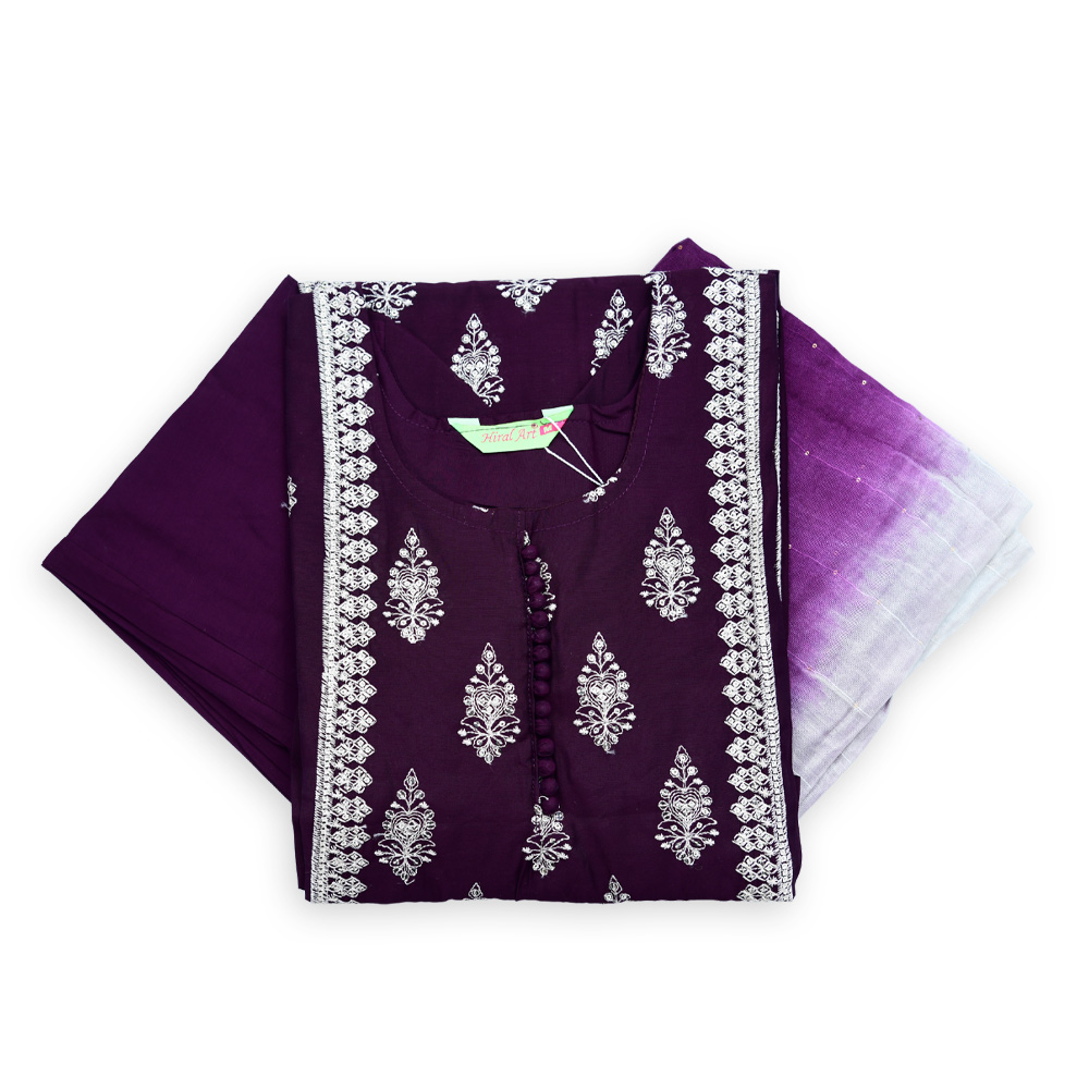 Step into sophistication with this exquisitely designed three-piece suit set. The rich purple tone, paired with delicate silver embroidery, creates a luxurious appeal. The lightweight fabric ensures comfort, while the contrasting dupatta completes this effortlessly stylish ensemble.