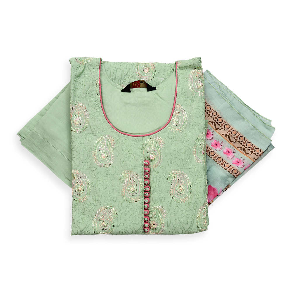 Step out in confidence with this beautifully designed salwar suit set. Featuring intricate threadwork with soft sequin accents, the kurta offers a refined charm. Paired with matching pants and a floral dupatta with elegant borders, this outfit blends traditional aesthetics with contemporary comfort.