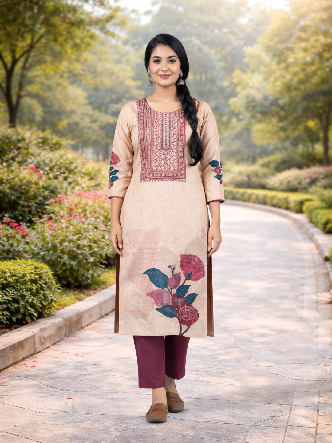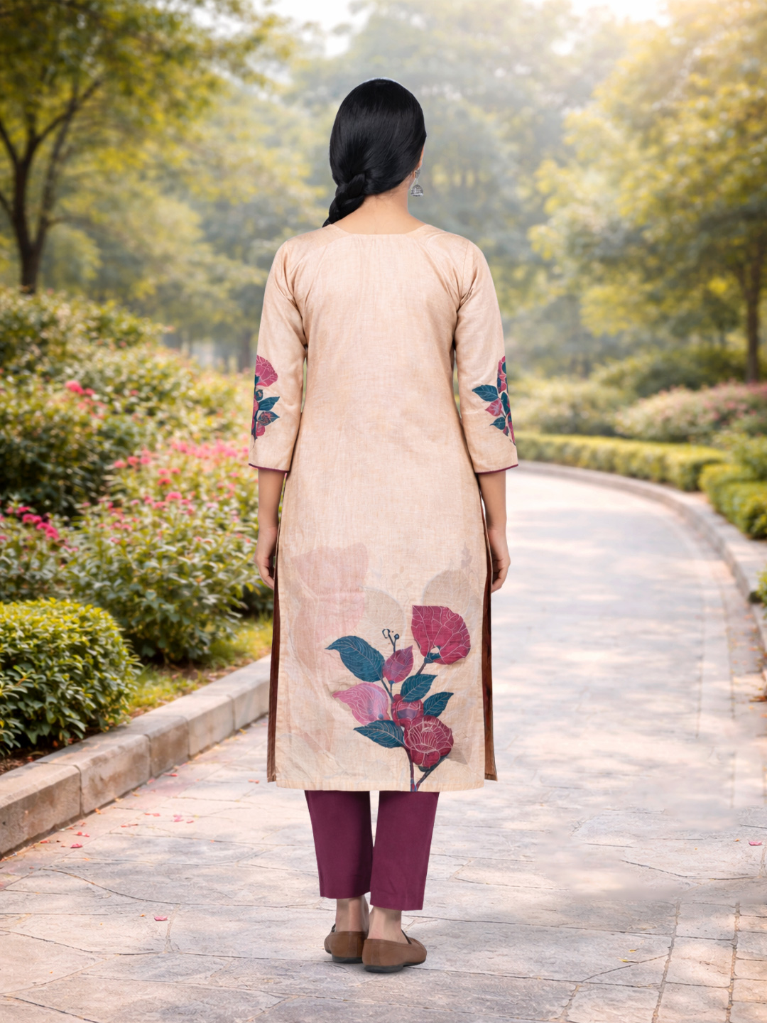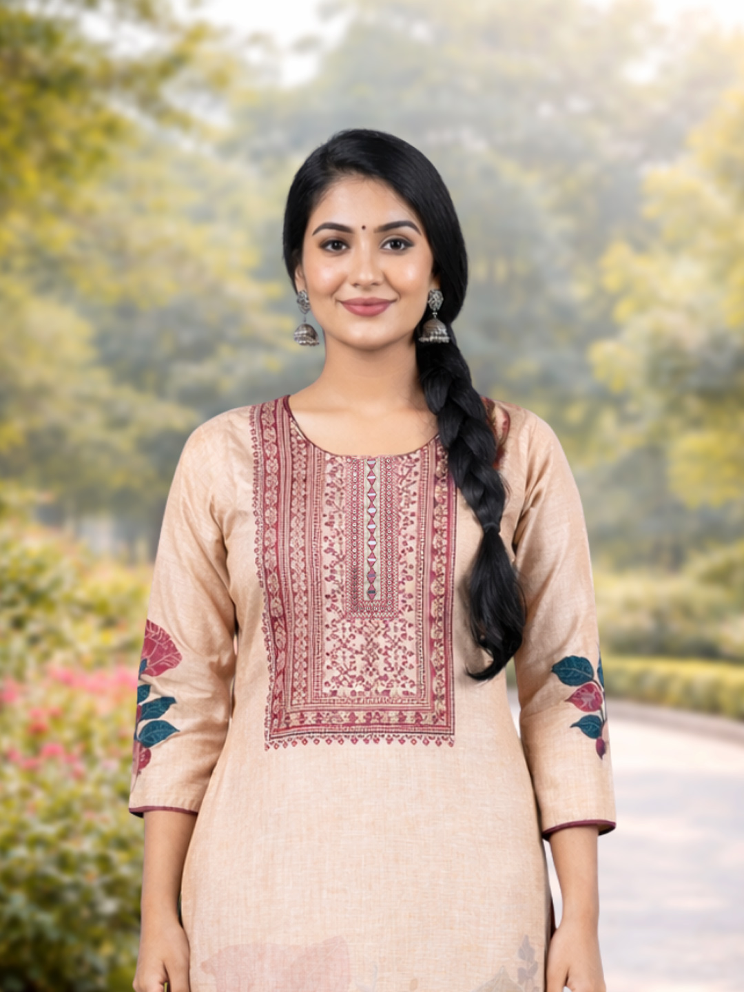 Celebrate timeless beauty with this stunning ensemble crafted with sequinned mirror work and artistic floral prints. The three-quarter sleeves and elegant cut make it versatile for both casual outings and semi-formal occasions. A coordinated dupatta with tassels adds the perfect finishing touch.