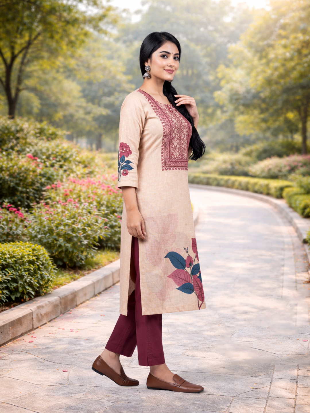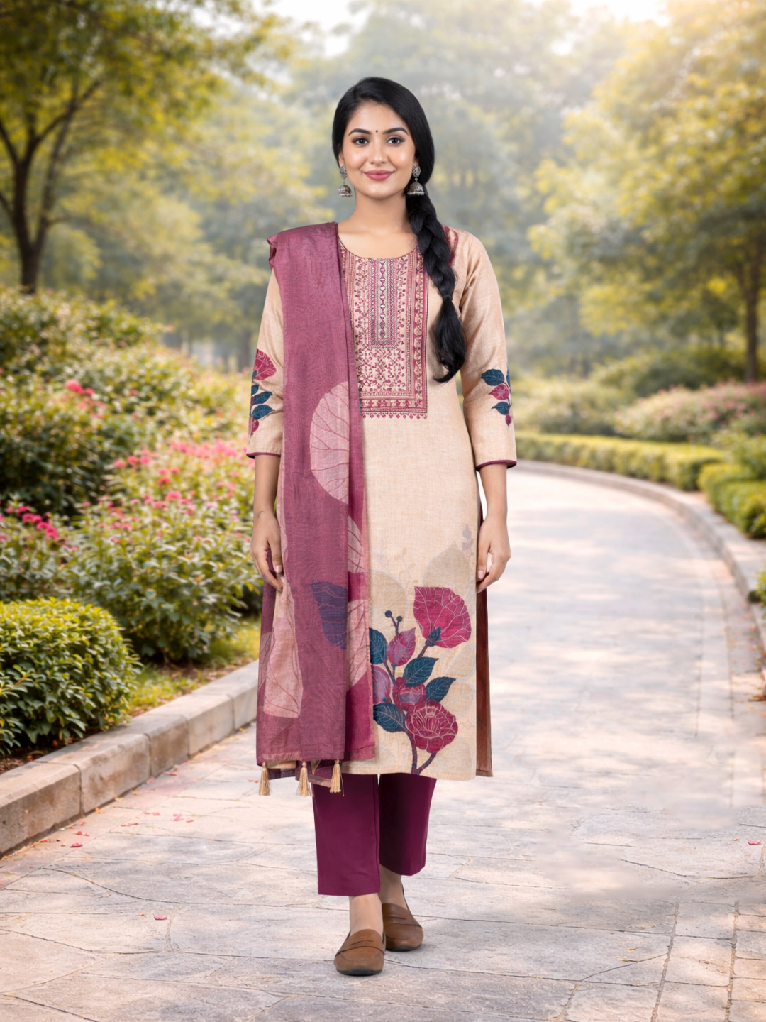 This salwar suit set brings together comfort and glamour effortlessly. The detailed embroidery on the neckline enhances its richness, while the lightweight fabric keeps you at ease. Styled with straight pants and a printed dupatta, it’s an ideal choice for refined everyday elegance.