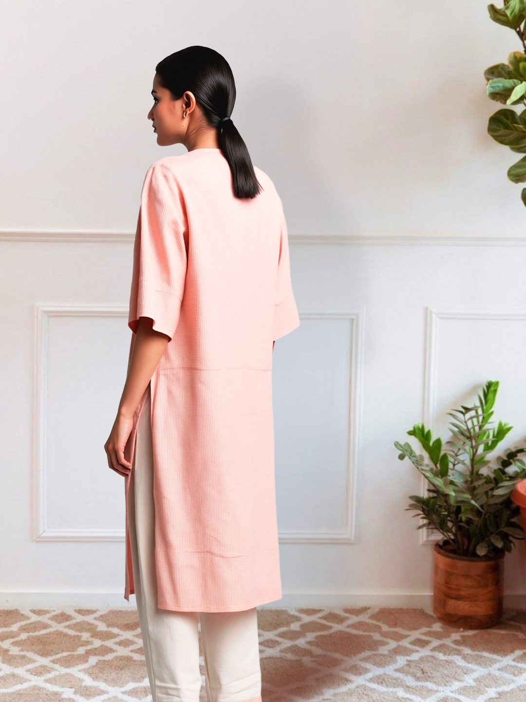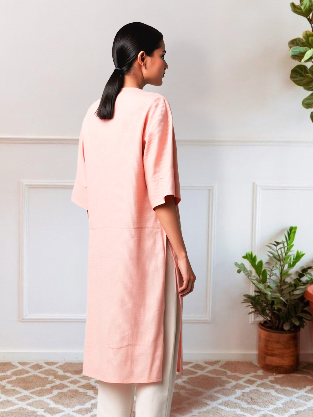 The 3/4 sleeves offer both comfort and style, making the kurta perfect for warmer days or layering during cooler weather. Their length adds a chic touch to the ensemble, offering just the right amount of coverage while keeping the look light and airy.