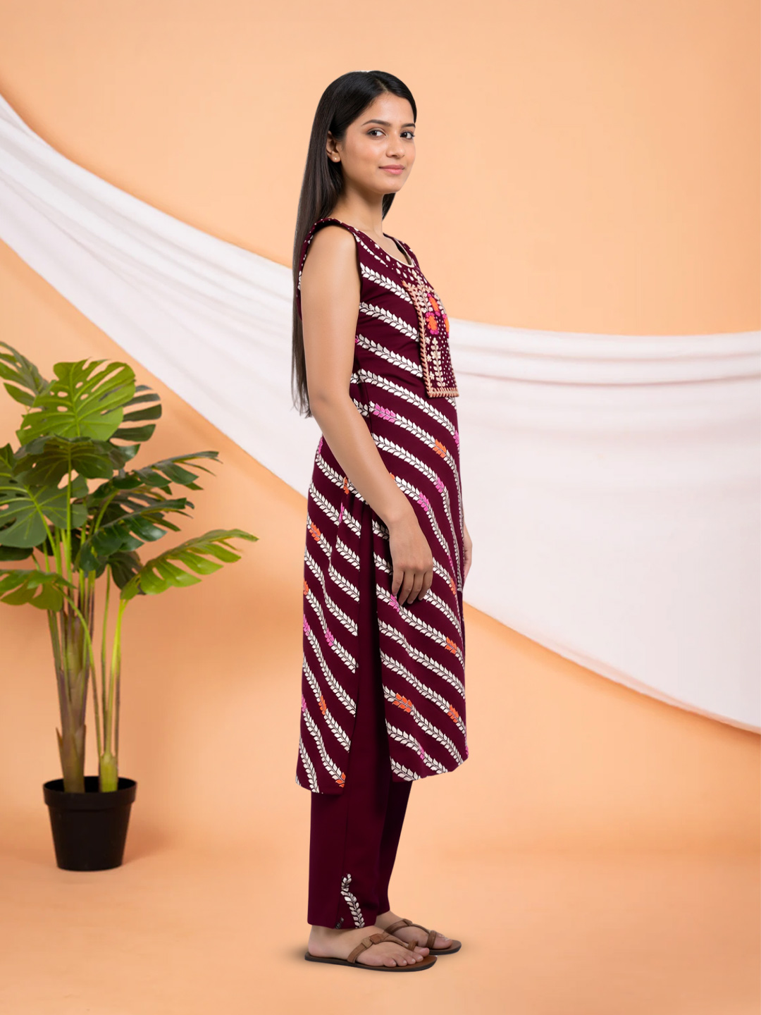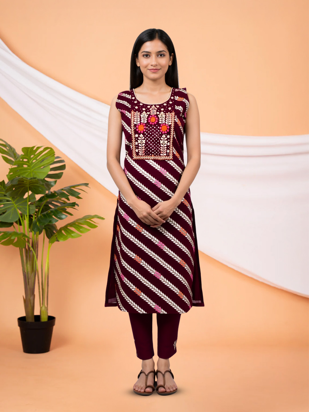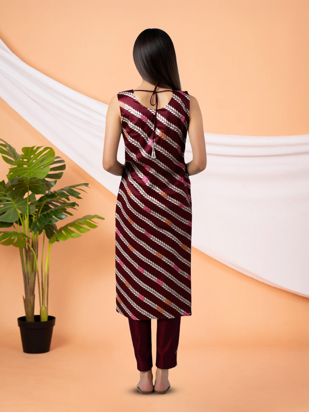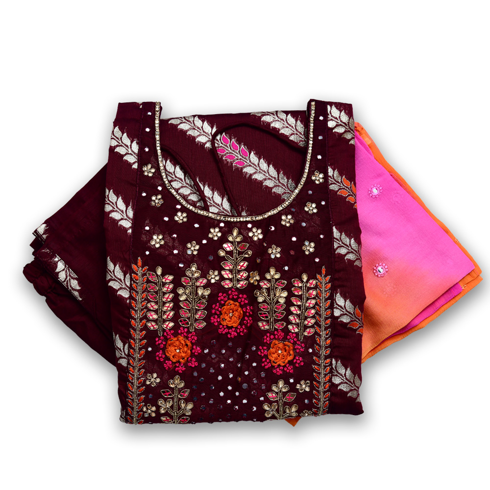 This luxurious salwar kameez set blends deep maroon tones with intricate gold embroidery, creating a striking statement of sophistication. The rich color palette paired with delicate floral patterns makes it a perfect choice for festive events, weddings, or any special occasion where elegance is key.