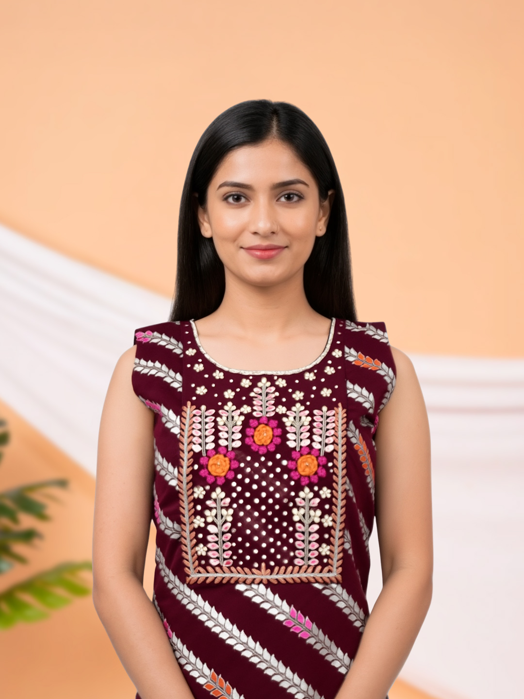 The matching maroon salwar combines comfort with elegance. Fitted at the ankles and featuring delicate embroidery, it balances the kameez perfectly, ensuring a stylish yet easy-to-wear fit. Ideal for long hours of celebration without compromising on chic appeal.