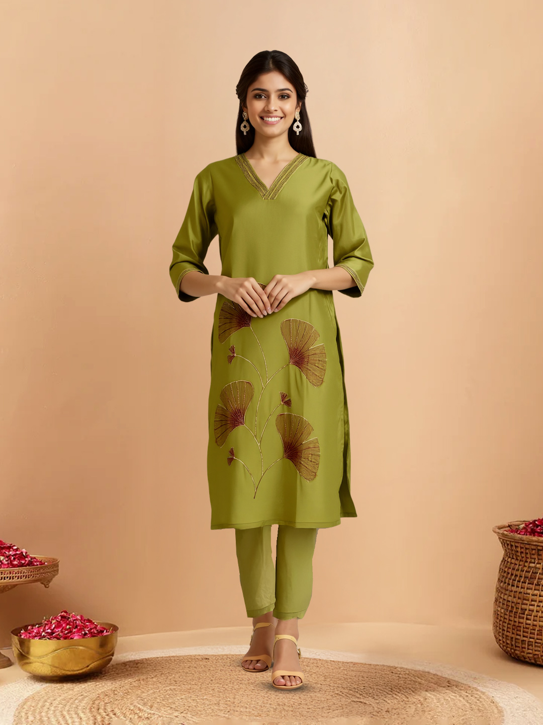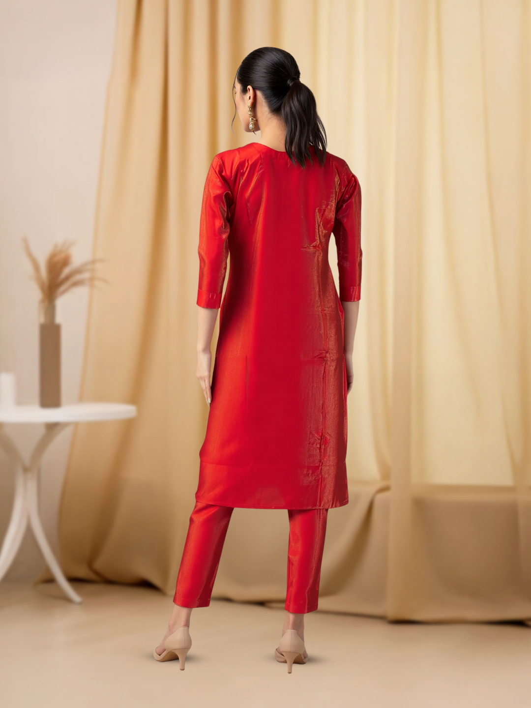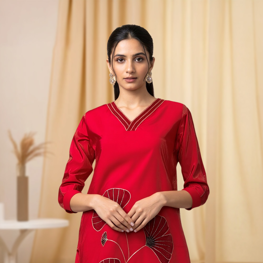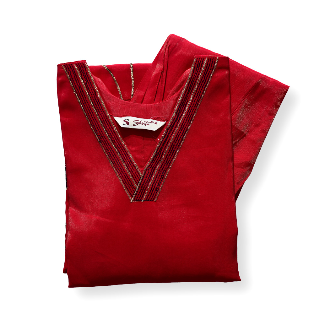 Add this embroidered kurta and pant set to your wardrobe for those moments when you want to look effortlessly polished. The silky, slightly glossy fabric brings a luxe finish, while the V-neck with stripe detailing, 3/4 sleeves, and sleek bottoms create a silhouette that’s equal parts graceful and contemporary.