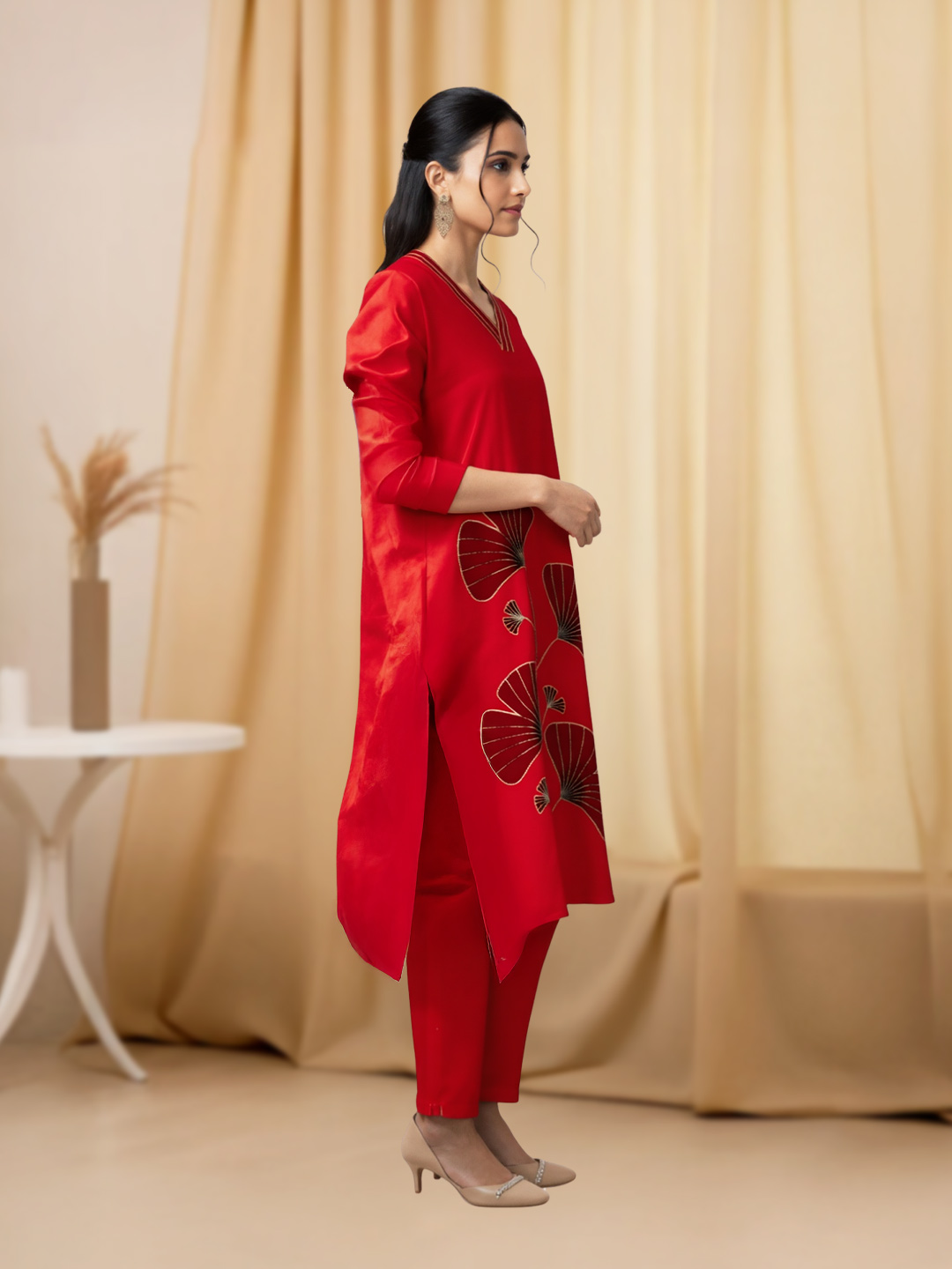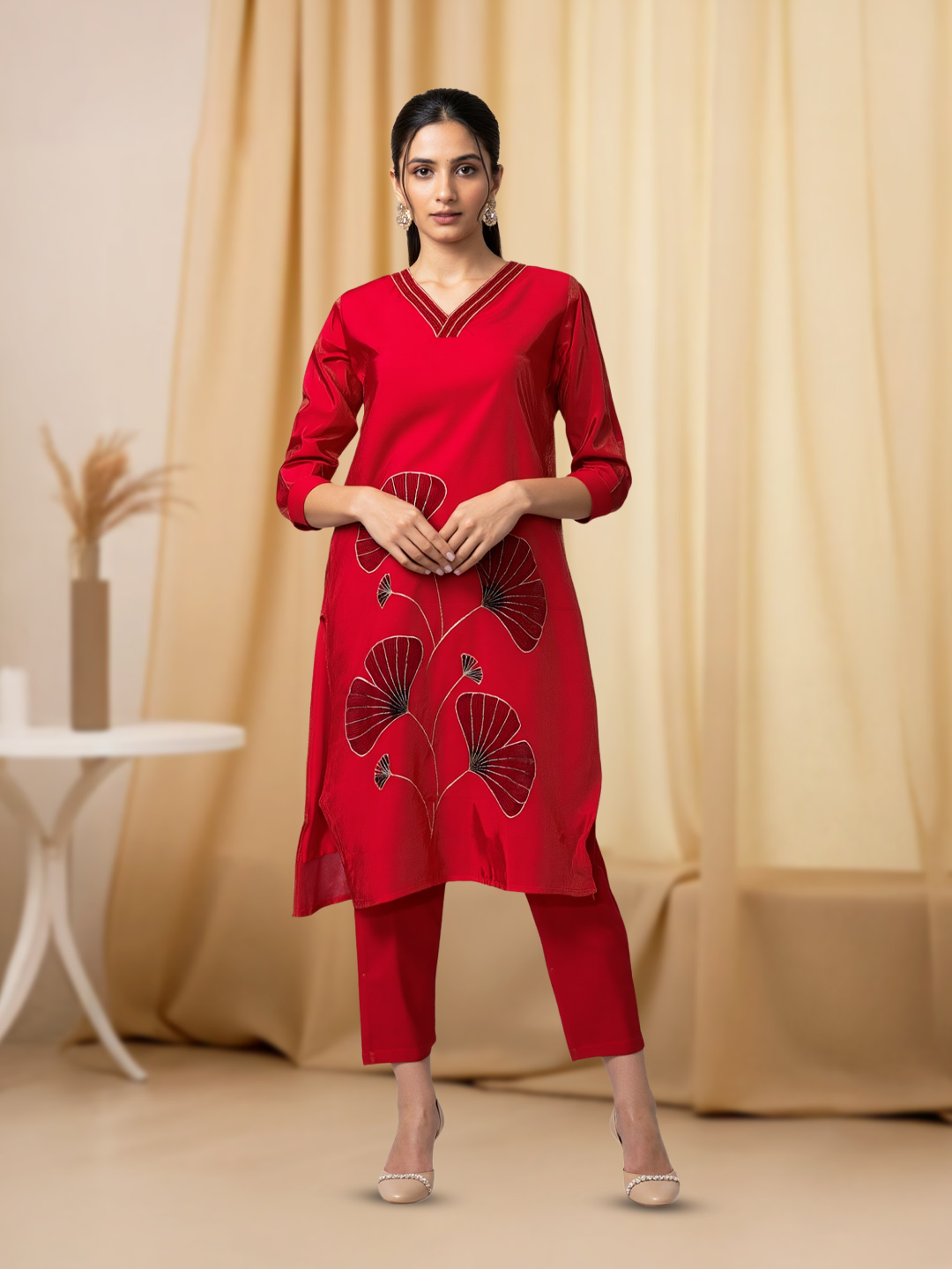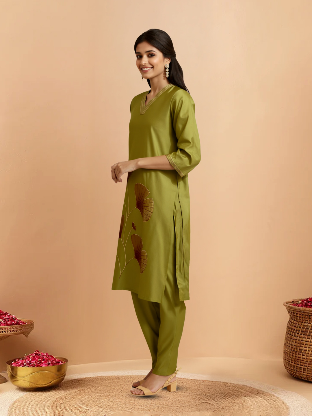 Add this embroidered kurta and pant set to your wardrobe for those moments when you want to look effortlessly polished. The silky, slightly glossy fabric brings a luxe finish, while the V-neck with stripe detailing, 3/4 sleeves, and sleek bottoms create a silhouette that’s equal parts graceful and contemporary.