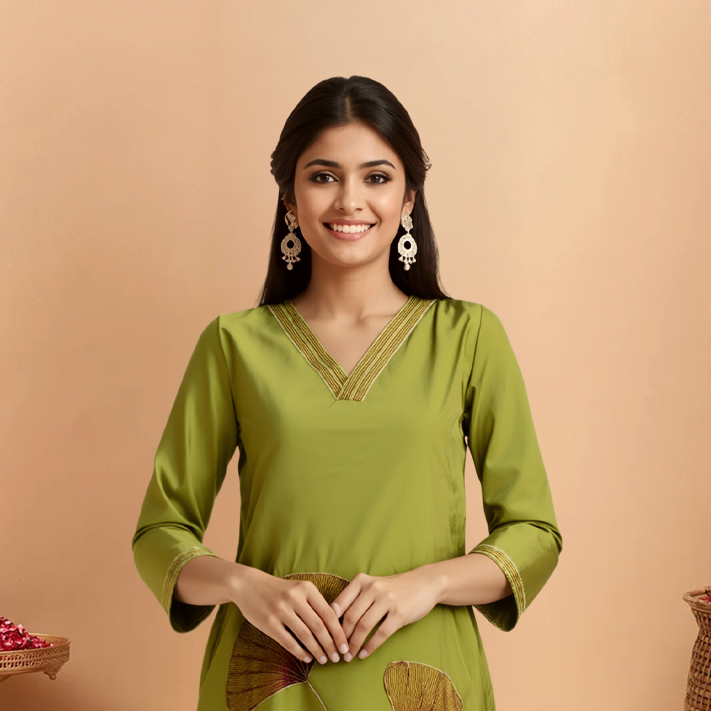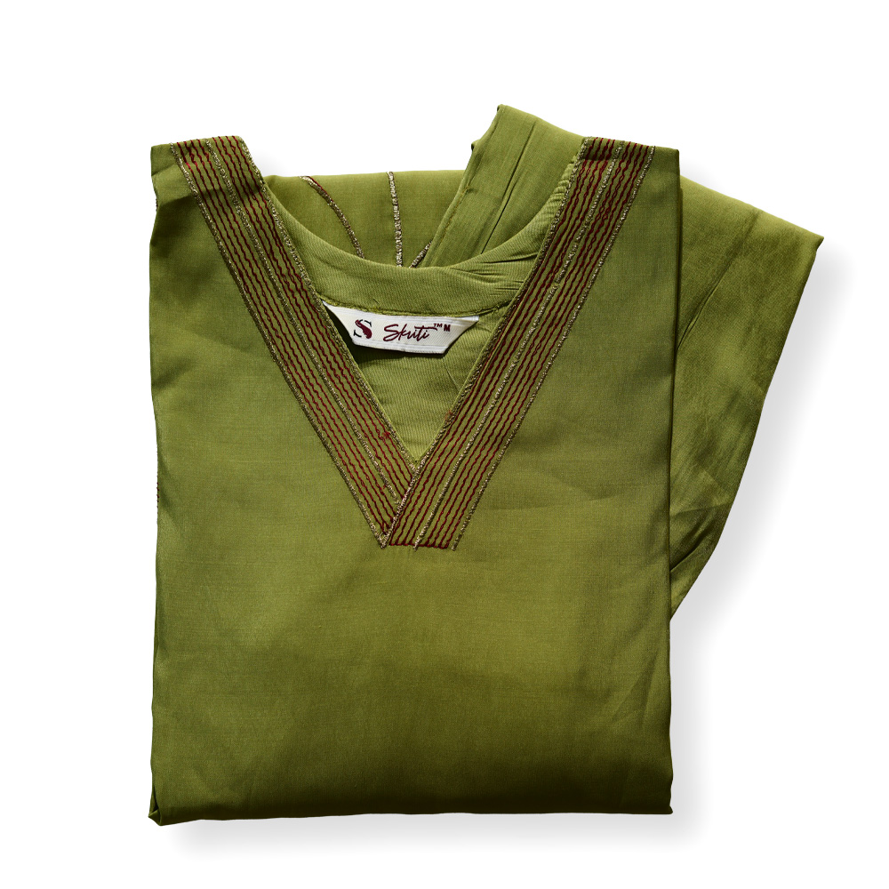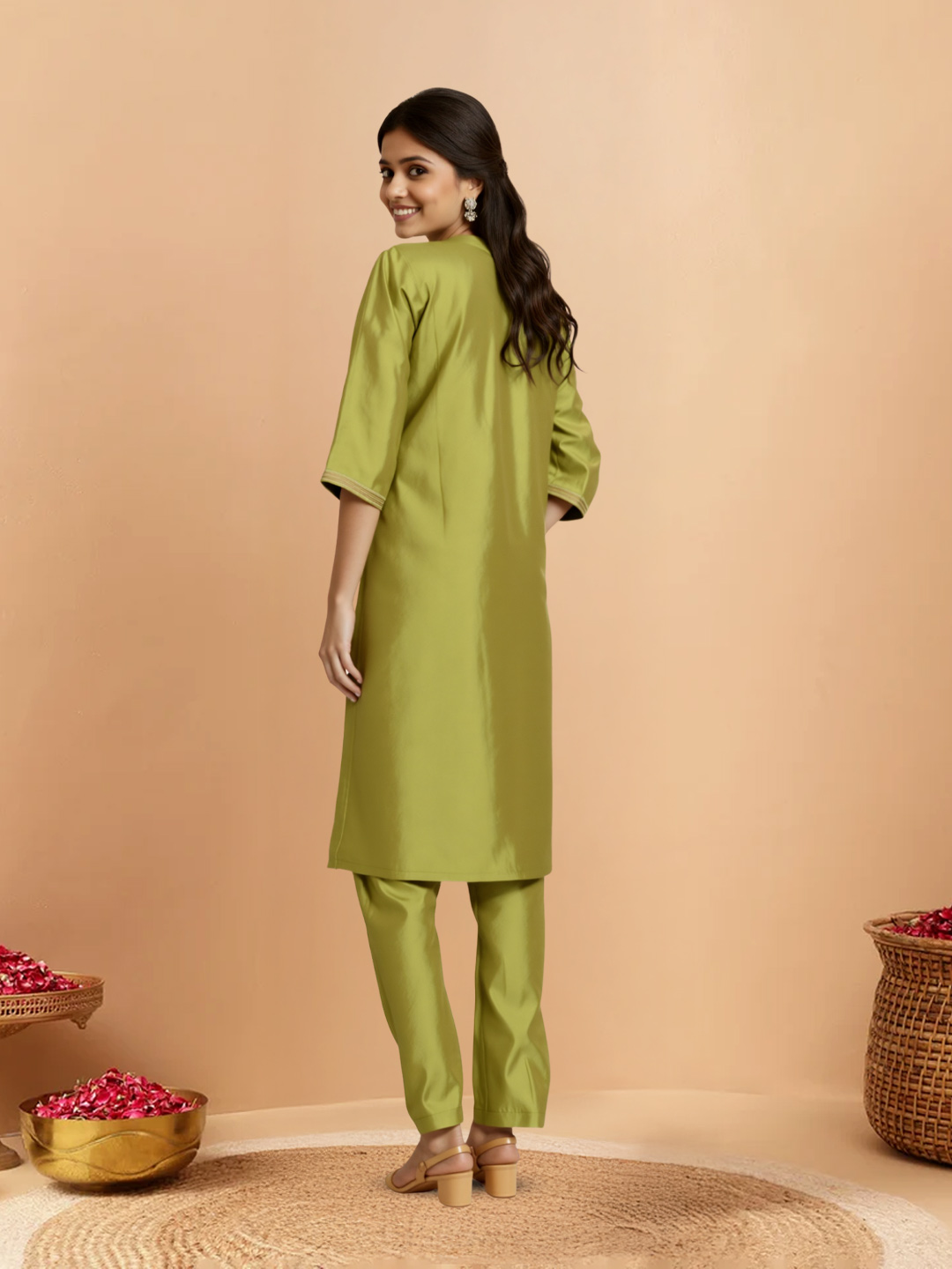Crafted from premium silky fabric with a subtle sheen, this kurta set blends comfort with sophistication. The V-neck with dual-stripe embroidery creates a polished look, complemented by graceful 3/4 sleeves and sleek straight-fit pants — ideal for festive gatherings or elegant evenings.