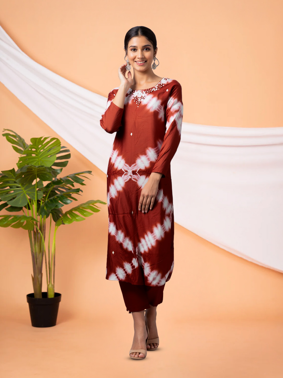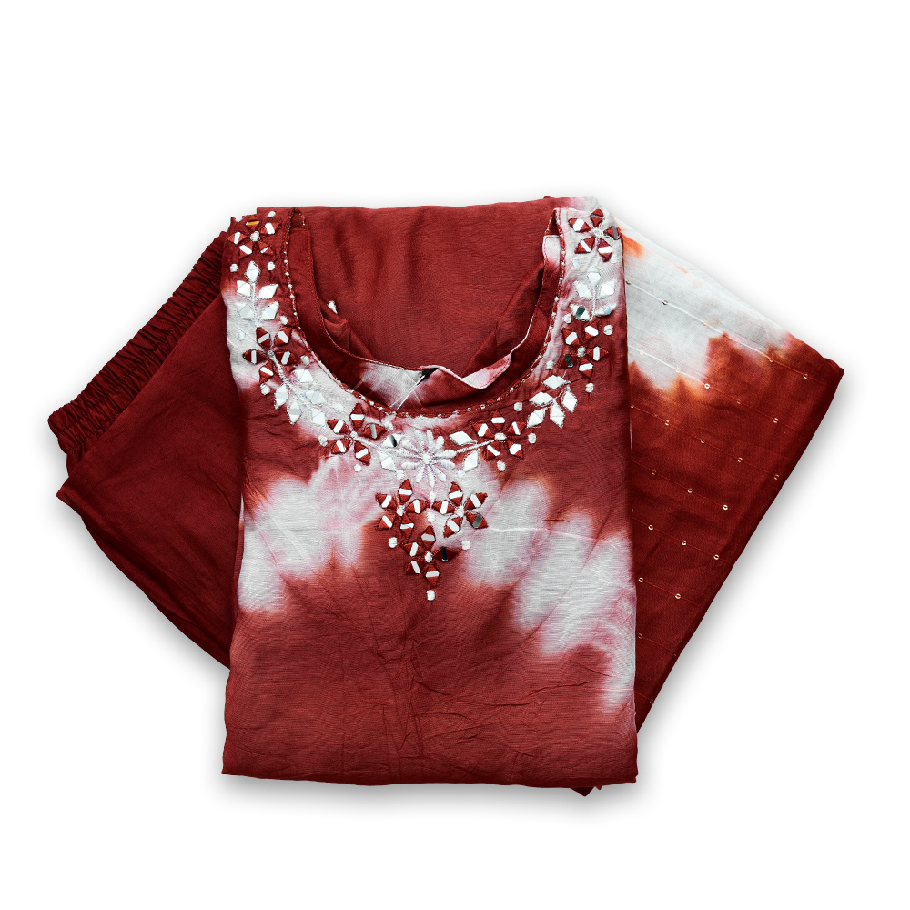Artistic white tie-dye accents give this outfit a unique and stylish appearance. The handcrafted look adds a modern edge while keeping the design rooted in ethnic charm, making it a standout piece in any wardrobe.