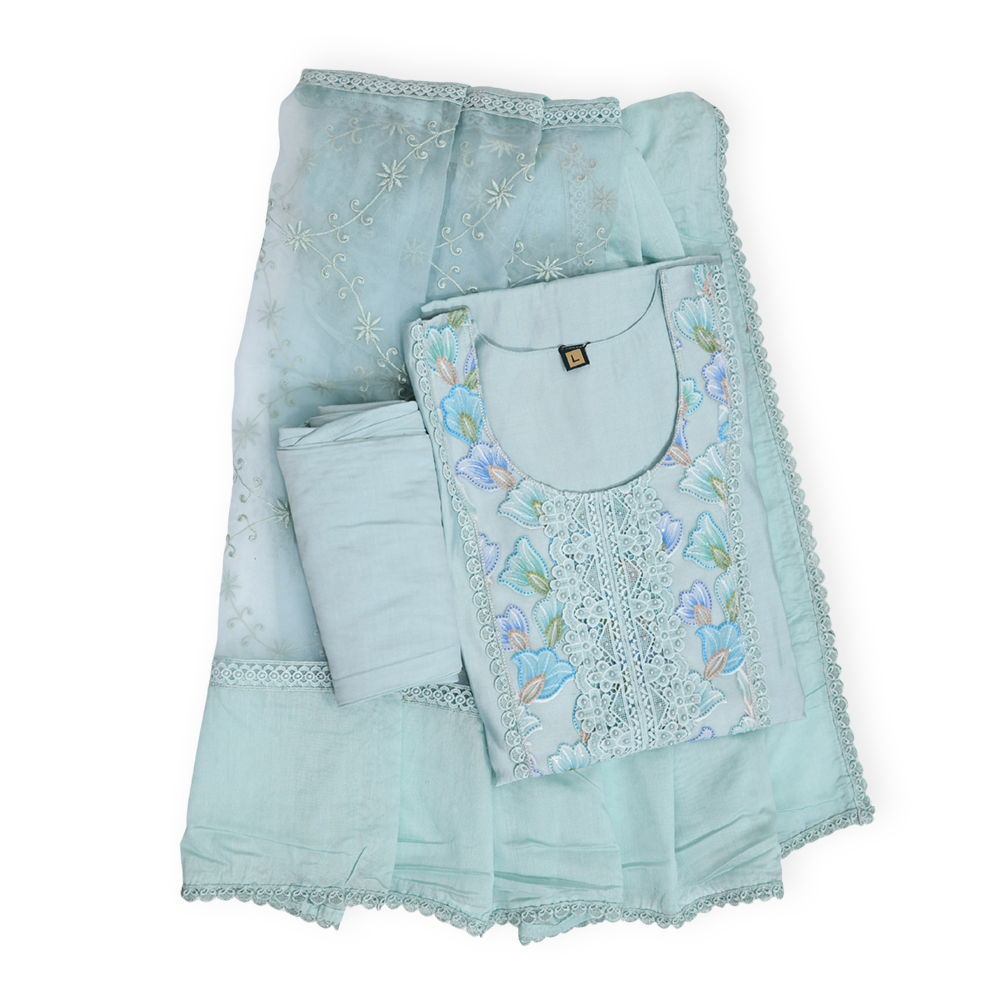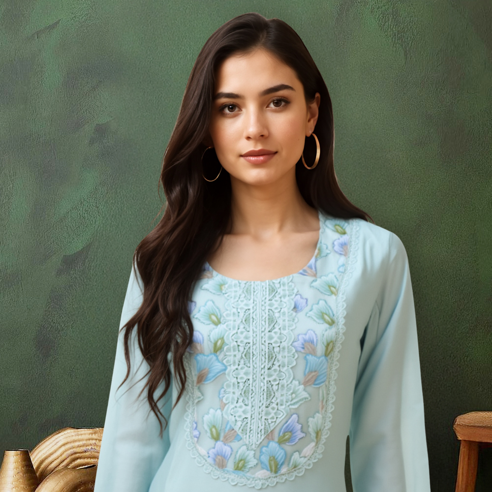 The exquisite floral embroidery in soft blues and greens adds a refined charm to the neckline, elevating the design with its intricate details. Whether it's for a festive occasion or a sophisticated gathering, this embroidered kurta exudes elegance and grace.
