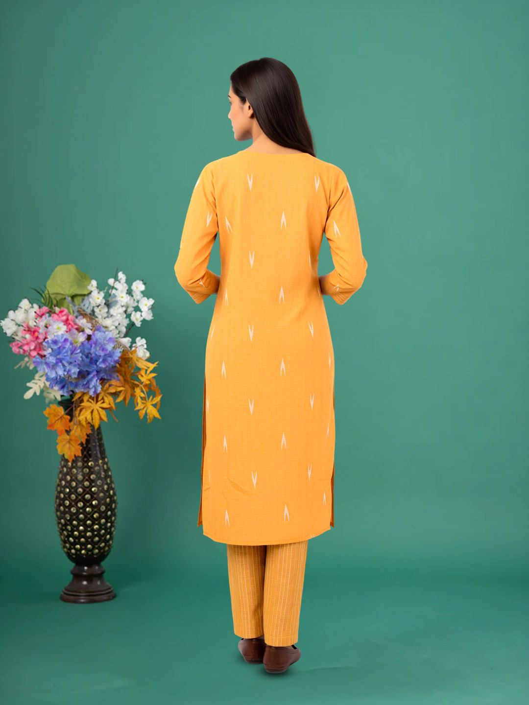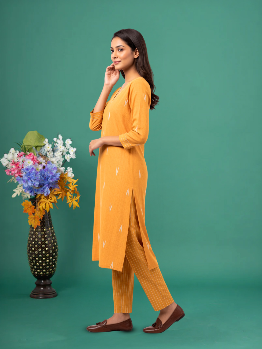 Discover the perfect balance of comfort and elegance with this thoughtfully designed kurta set. The subtle woven motifs lend texture to the fabric, while the beautifully detailed V-neckline enhances the overall appeal..