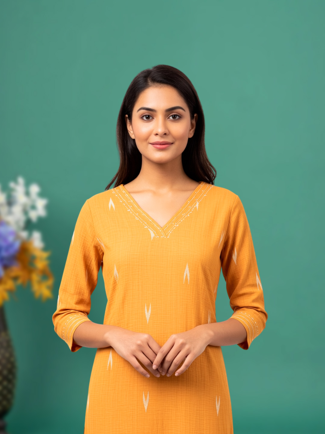 Crafted for the woman who appreciates understated beauty, this Thread Detailing V-Neck Kurta Set blends classic aesthetics with contemporary tailoring. The fine thread work along the V-neckline brings a refined finish, while the woven motifs add gentle dimension.