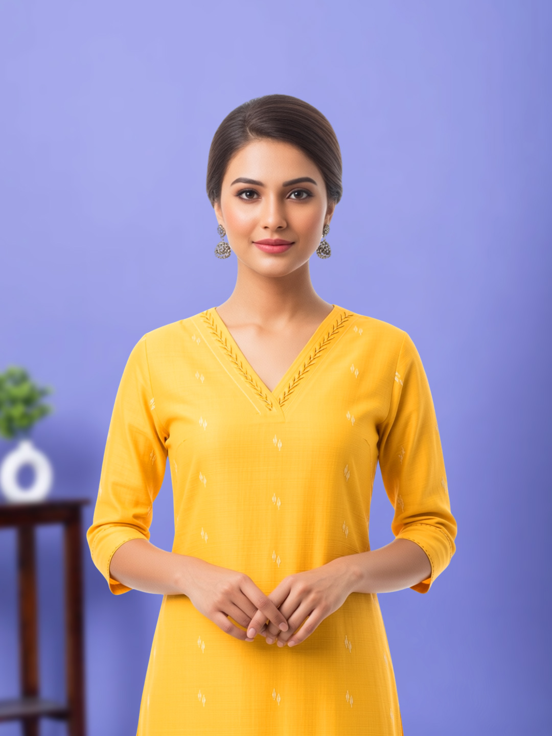 Step out in confidence with this elegant and breathable kurta pant set. Crafted with a lightweight fabric feel, it ensures all-day ease without compromising on style. The thread work V-neckline serves as a refined focal point, adding delicate charm.
