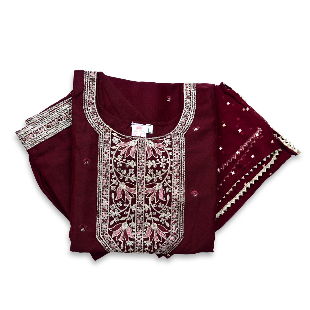 Designed to impress, this suit set features detailed embroidery enhanced with subtle sequin accents for a touch of sparkle. The soft fabric drapes beautifully, offering both comfort and sophistication. With its structured straight pants and a finely detailed dupatta, this outfit is a perfect choice for festive and semi-formal wear.
