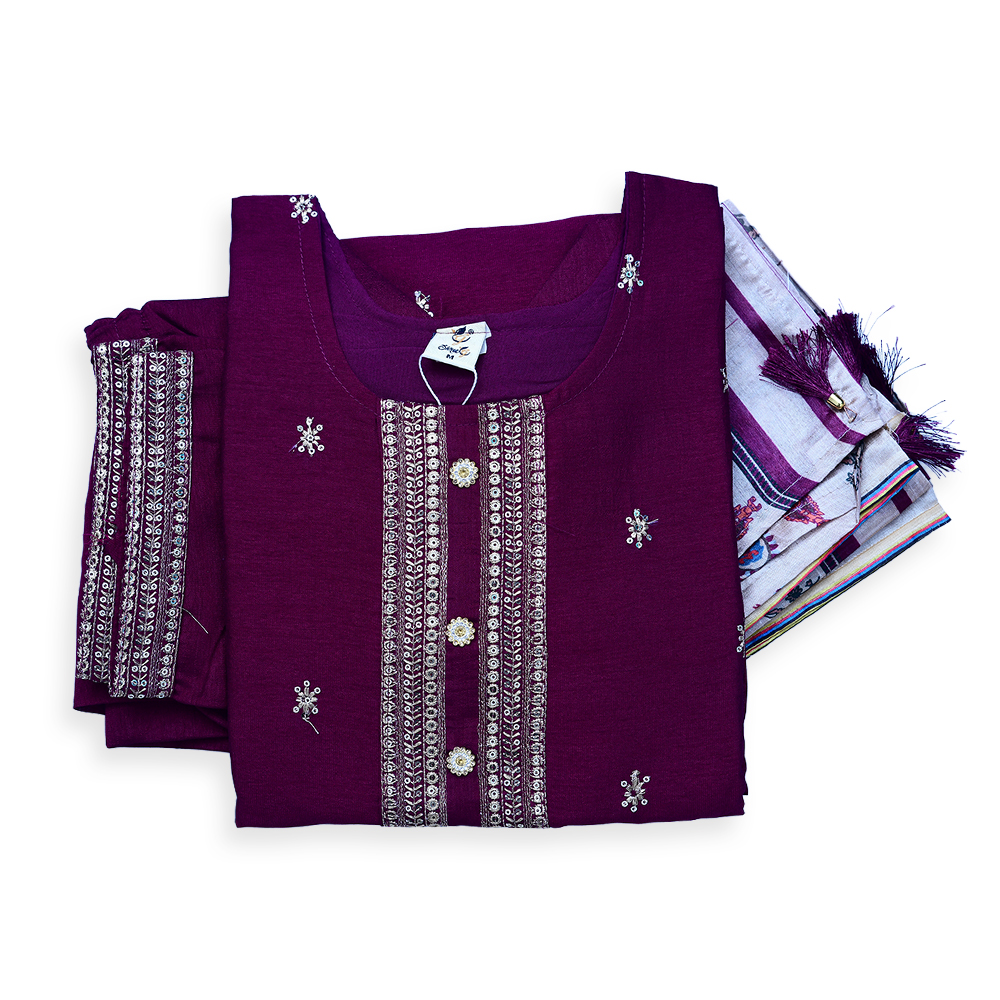 Designed for effortless elegance, this suit set features intricate threadwork embroidery complemented by soft sequin highlights. The kurta’s clean silhouette provides a polished look, while the breathable fabric ensures all-day comfort. The coordinated pants and stylish dupatta with detailed patterns and borders complete this refined traditional outfit.