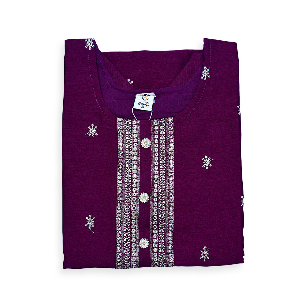 This salwar suit set is perfect for those who appreciate understated beauty with a hint of sparkle. The embroidered neckline and scattered sequinned motifs add depth without overwhelming the design. The straight-cut kurta, paired with well-fitted churidar pants and a graceful dupatta, creates a look that is both modern and timeless.