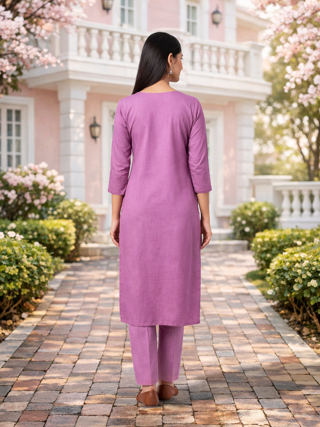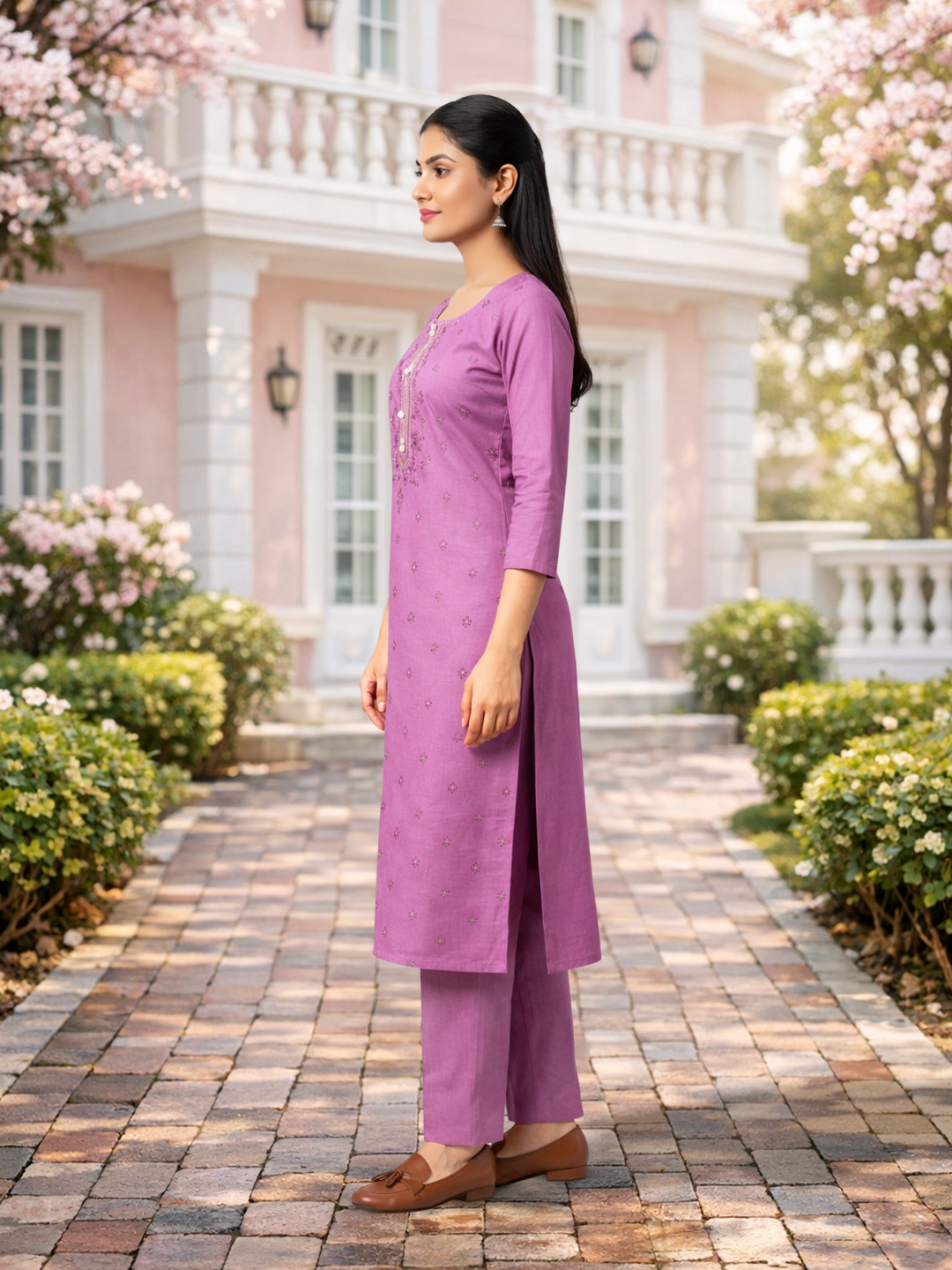 Crafted from premium breathable fabric, this suit set ensures all-day comfort without compromising on style. The classic round neckline with a decorative button placket and coordinated straight-fit pants make it a perfect blend of sophistication and ease.