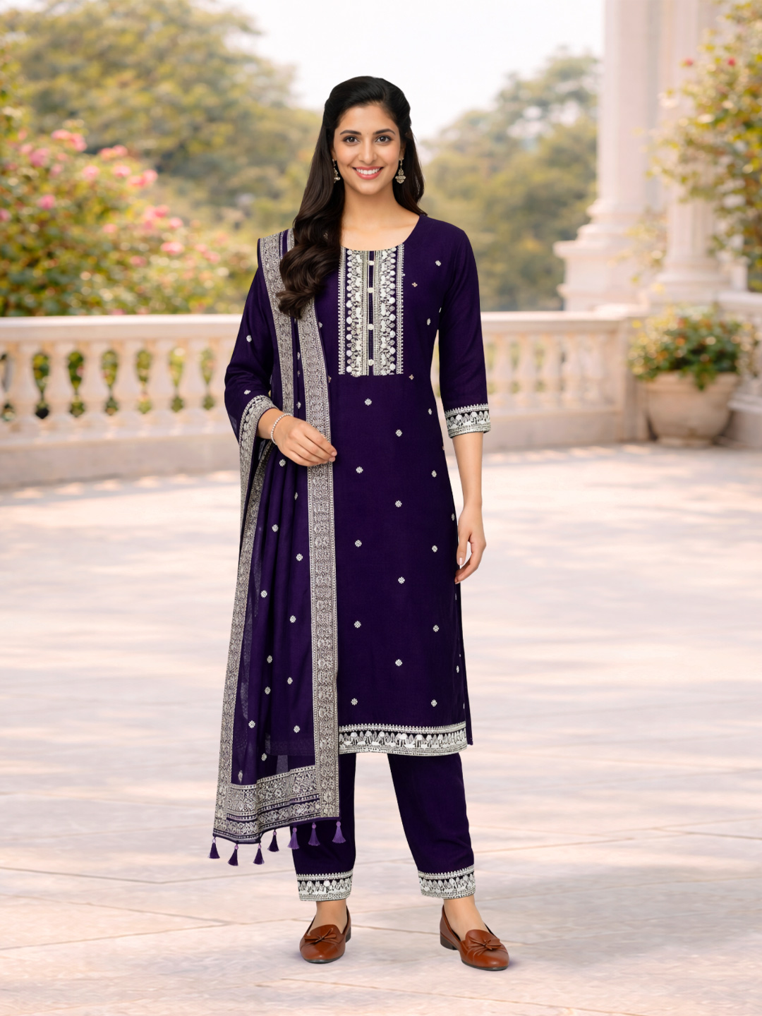 Embrace classic ethnic charm with this beautifully crafted salwar suit set. Featuring an elegant round embroidered neckline and delicate threadwork motifs, this outfit exudes grace and sophistication. Paired with matching churidar pants and a lightweight dupatta, it’s perfect for traditional occasions.