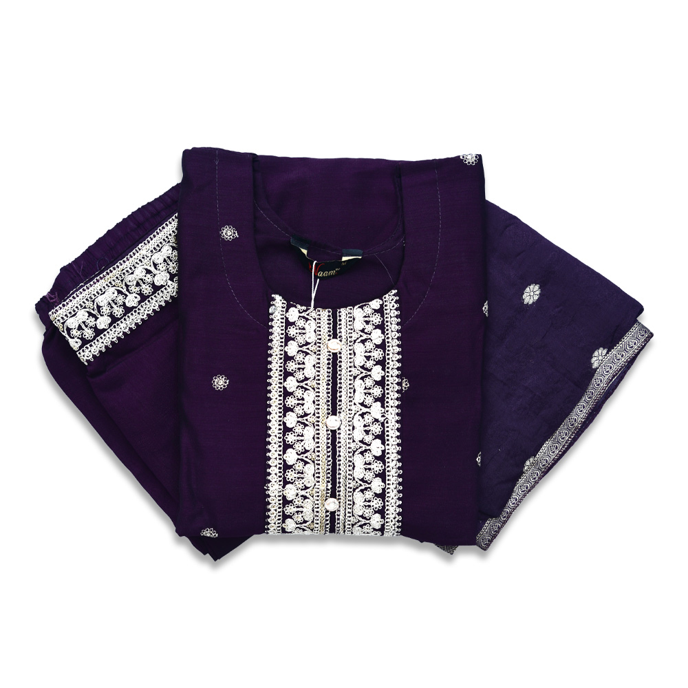 Designed for comfort and elegance, this 3-piece suit set offers a refined look with its intricate embroidery and soft fabric. The coordinated churidar pants and airy dupatta make it a versatile choice for both casual wear and festive moments.