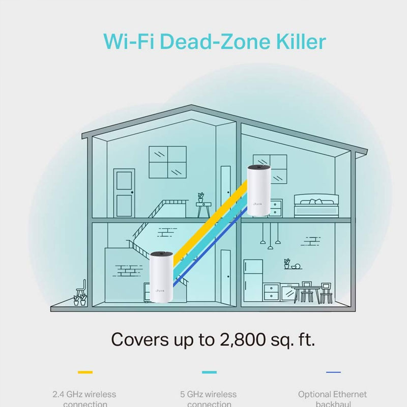 Deco M4 is the simplest way to provide a strong Wi-Fi signal in every corner of your home up to 2,800 square feet (2-pack). Wireless connections and optional Ethernet backhaul work together to link Deco units, providing even faster network speeds and truly seamless coverage. Want more coverage? Simply add another Deco.