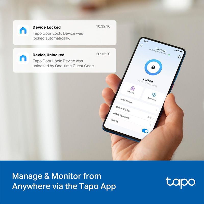 Keyless keypad, energy-efficient Bluetooth for nearby access, remote Wi-Fi via the Tapo App, voice commands with PIN verification, and 2 backup keys for peace of mind.