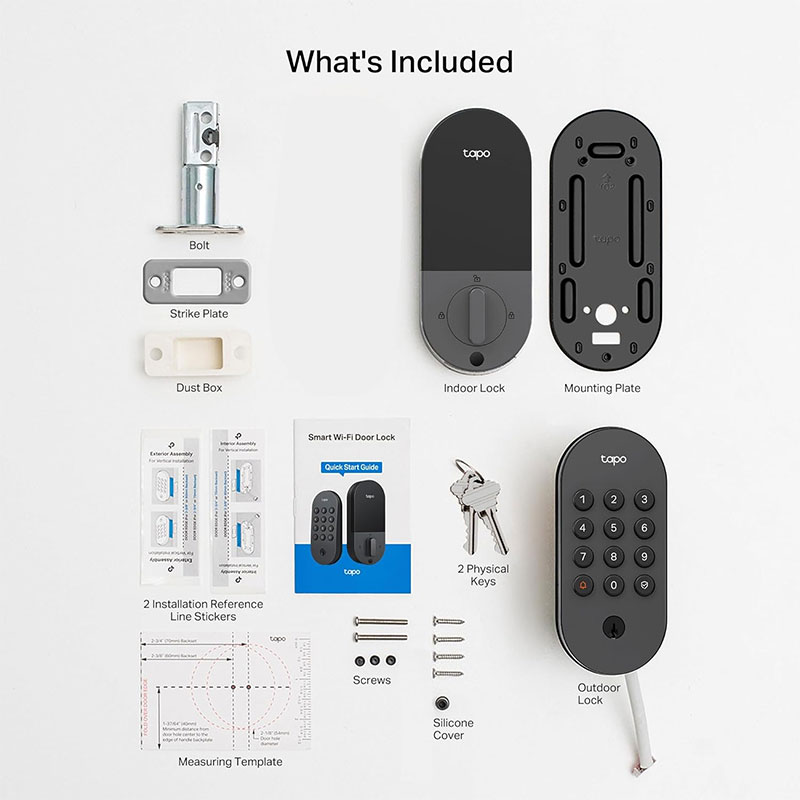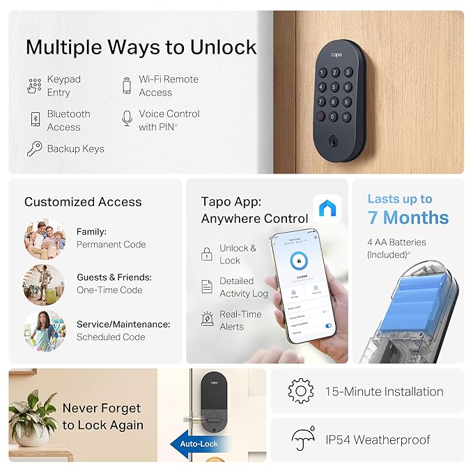 Keyless keypad, energy-efficient Bluetooth for nearby access, remote Wi-Fi via the Tapo App, voice commands with PIN verification, and 2 backup keys for peace of mind.