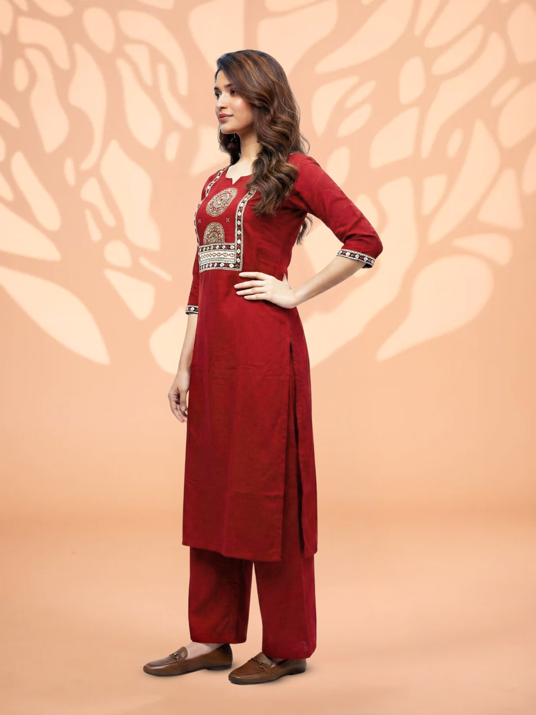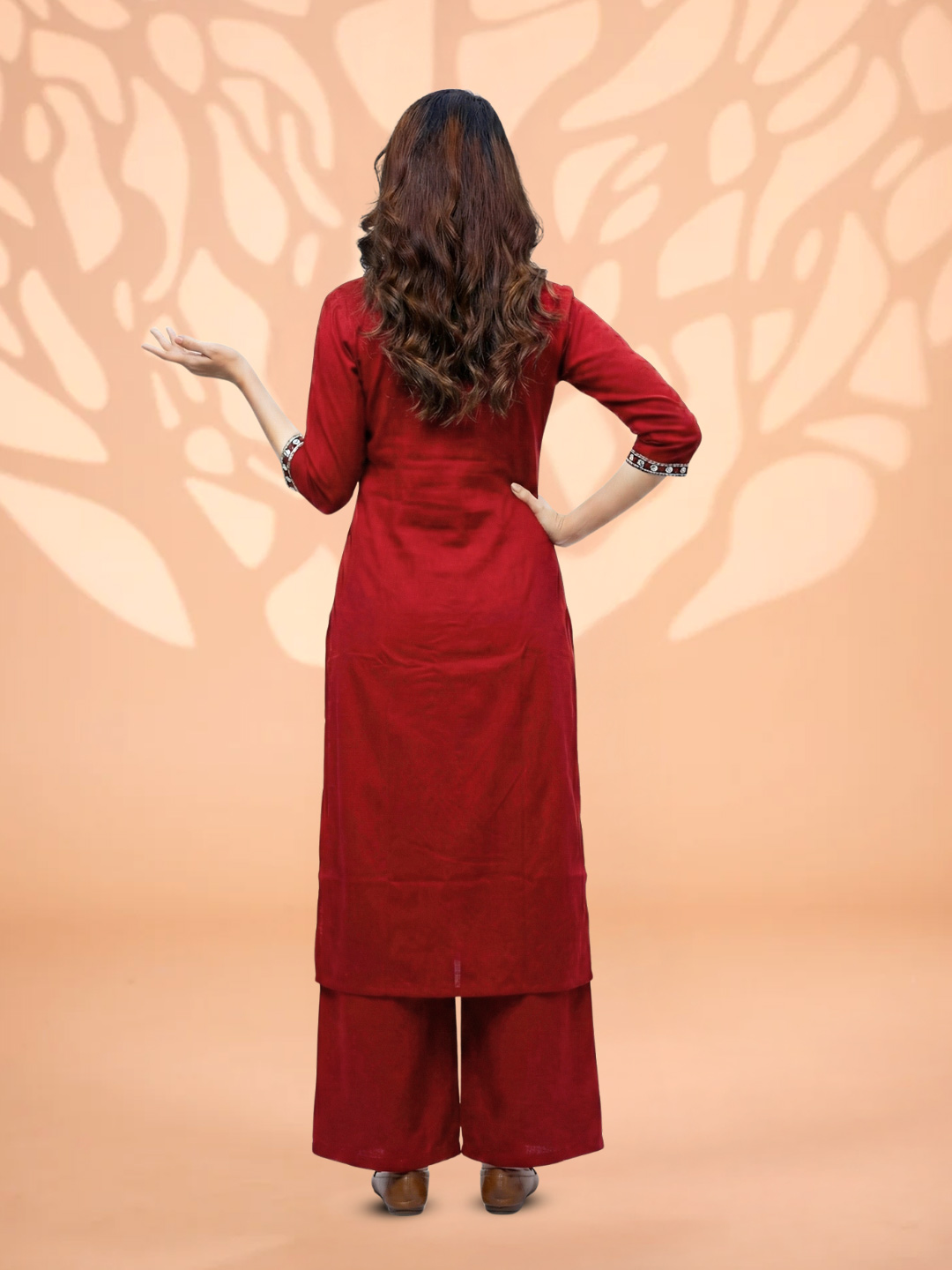 The Traditional Embroidery Notched Neckline Kurta with Palazzo Set is a perfect blend of classic design and modern comfort. Featuring a straight-fit kurta and matching pants, this ensemble offers effortless style and sophistication for any occasion, while the intricate embroidery adds a touch of tradition.