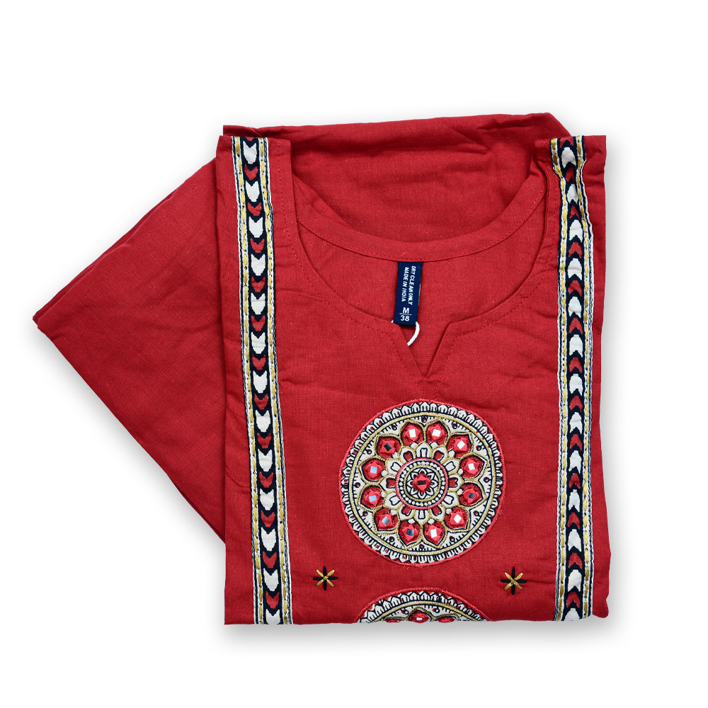 The intricate, circular embroidery in contrasting colors adds depth and character to the outfit, making it a standout piece. This fine detailing enhances the traditional appeal of the kurta, giving you a refined, stylish look with a modern twist.