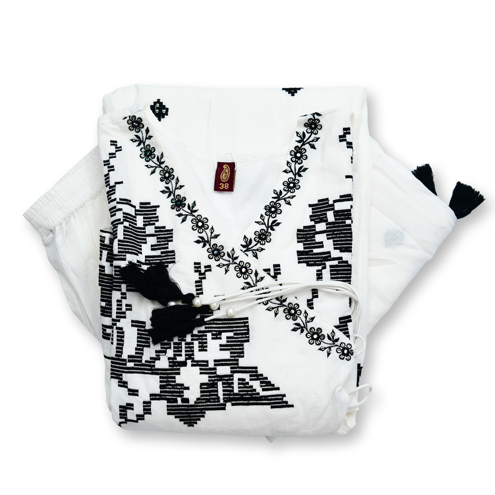 Make a lasting impression with this traditionally inspired salwar suit set. The kurta highlights intricate ethnic motifs and a finely embroidered V-neck border that enhances its timeless appeal. Three-quarter sleeves with matching embroidery add a touch of sophistication, while the ankle-length design ensures an elegant look. Light in weight and soft on the skin, this outfit comes with a coordinated white dupatta to complete the classic ethnic ensemble.