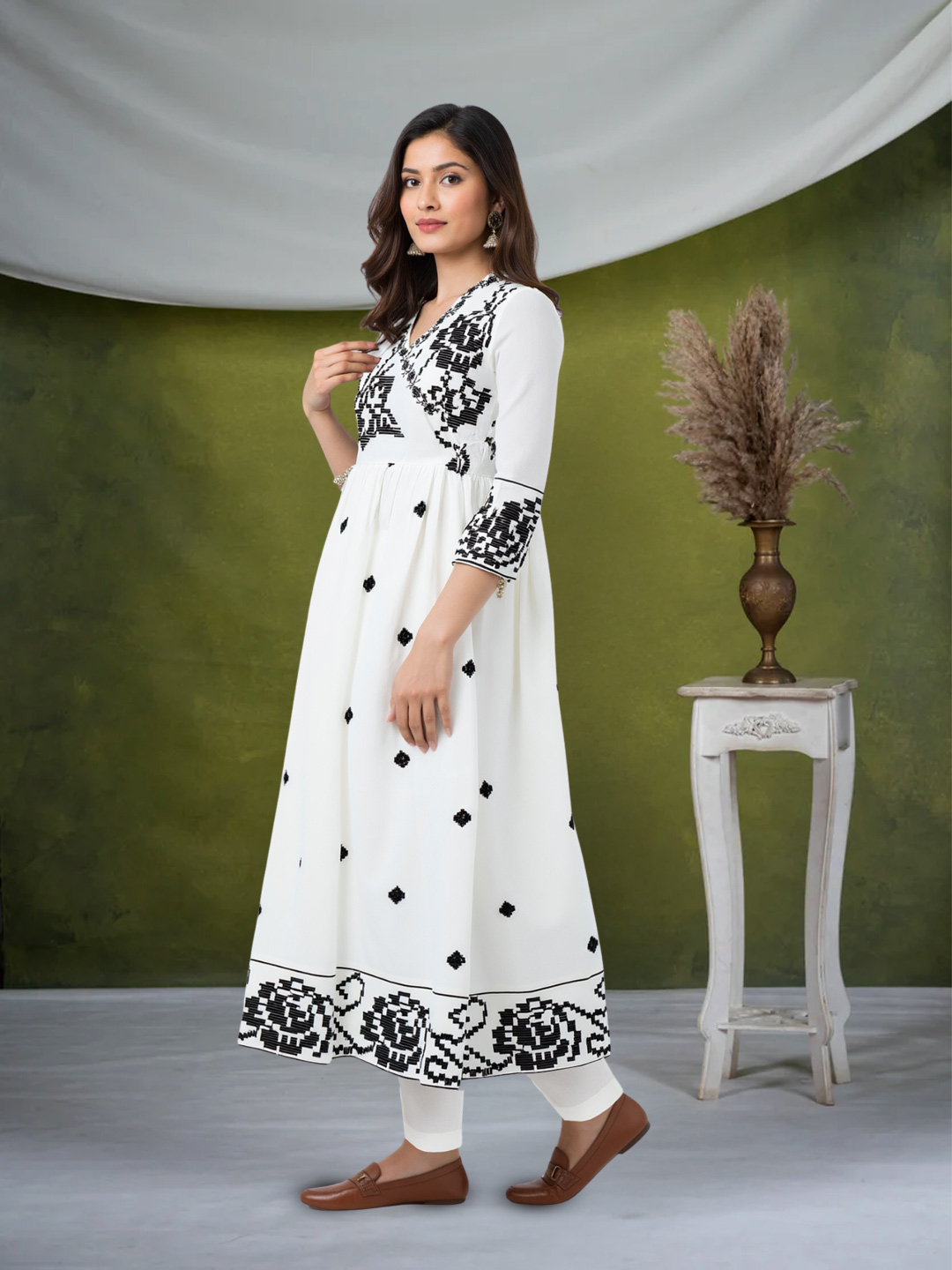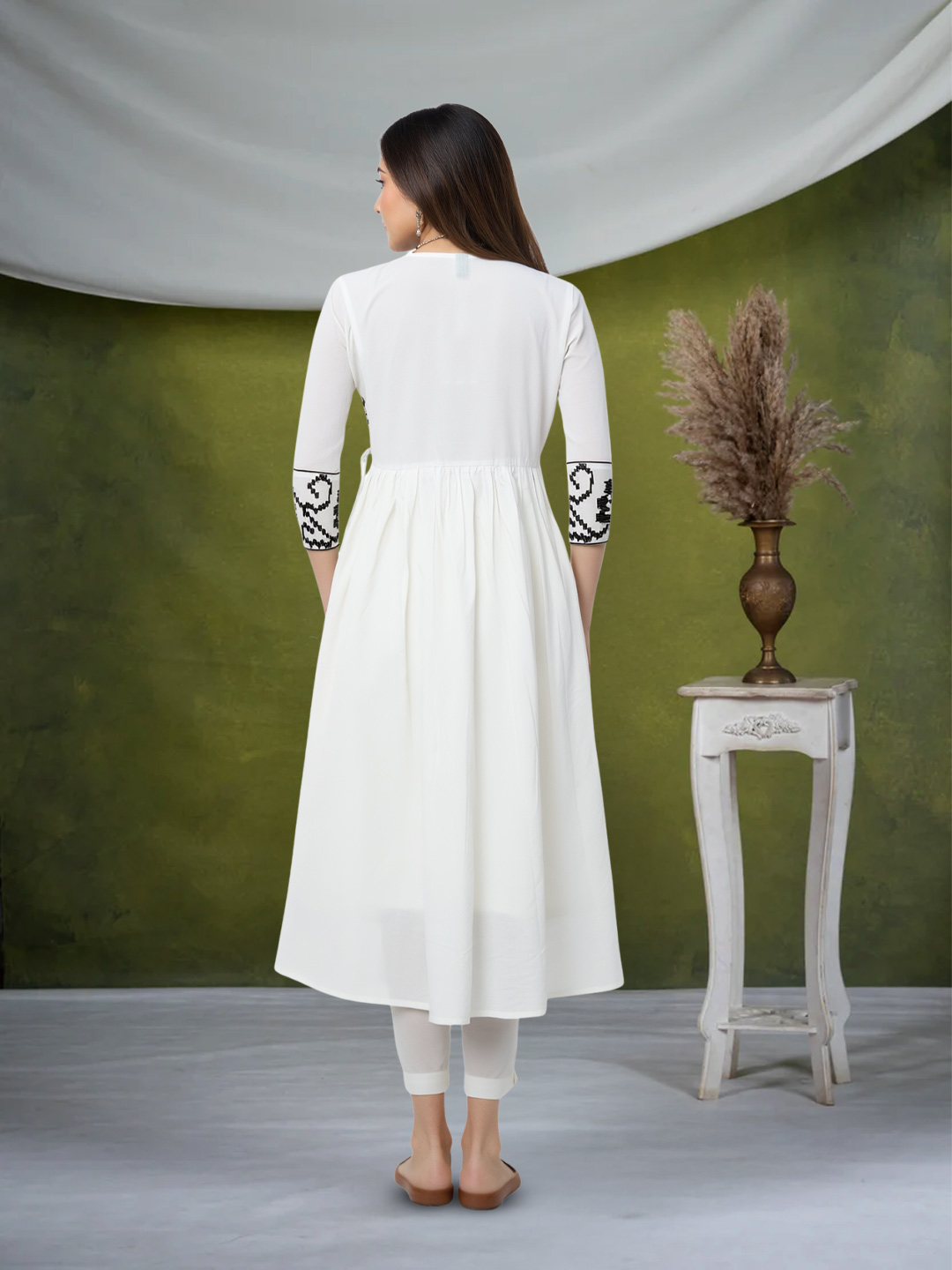 Designed for women who value both style and ease, this salwar suit set offers unmatched elegance and comfort. The soft, flowy fabric drapes beautifully, while the embroidered ethnic motifs elevate its overall appeal. Featuring a flattering V-neckline, three-quarter embroidered sleeves, and an ankle-length kurta, the ensemble is completed with a white dupatta adorned with delicate motifs—perfect for long festive days or evening gatherings.