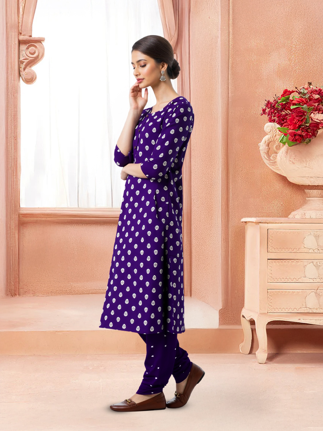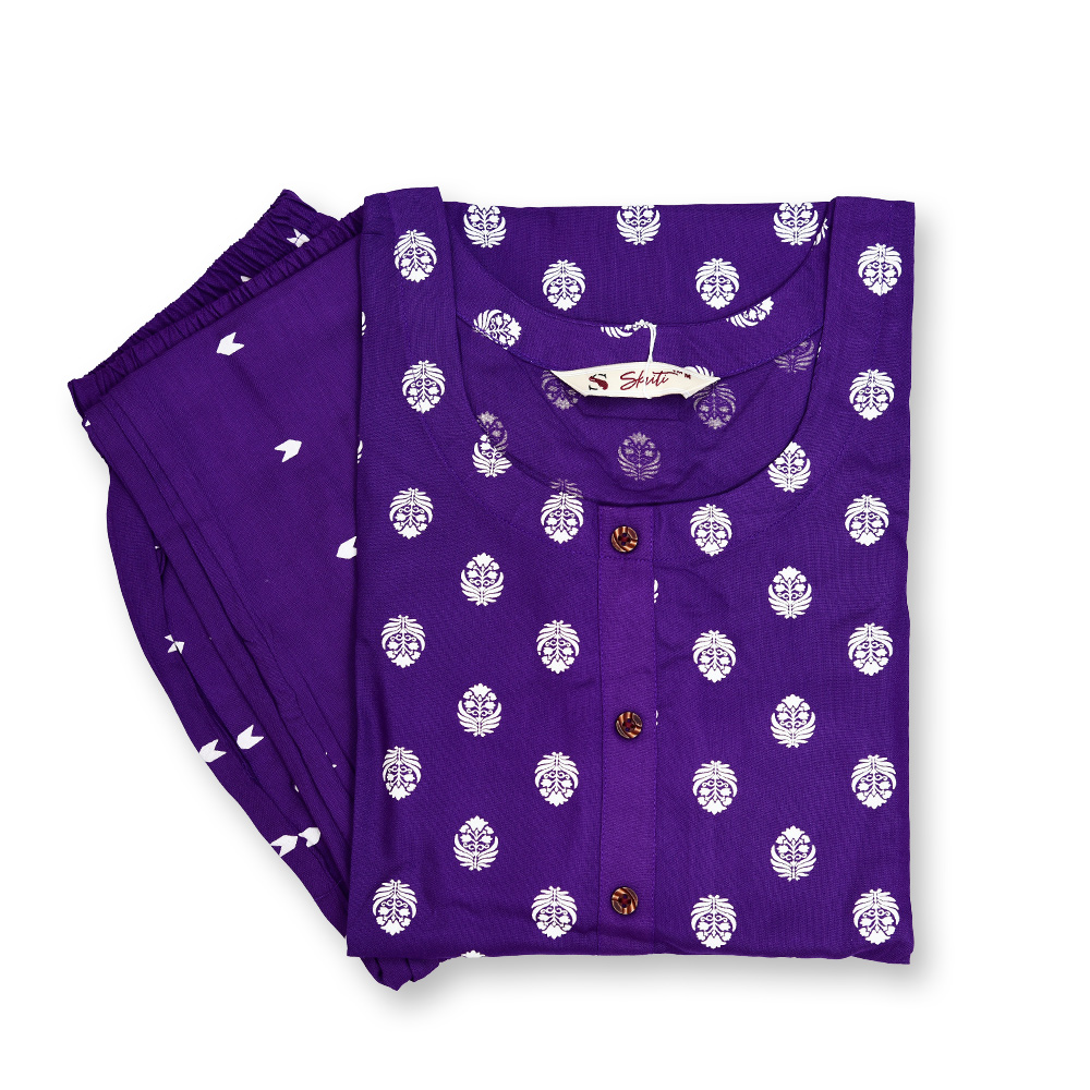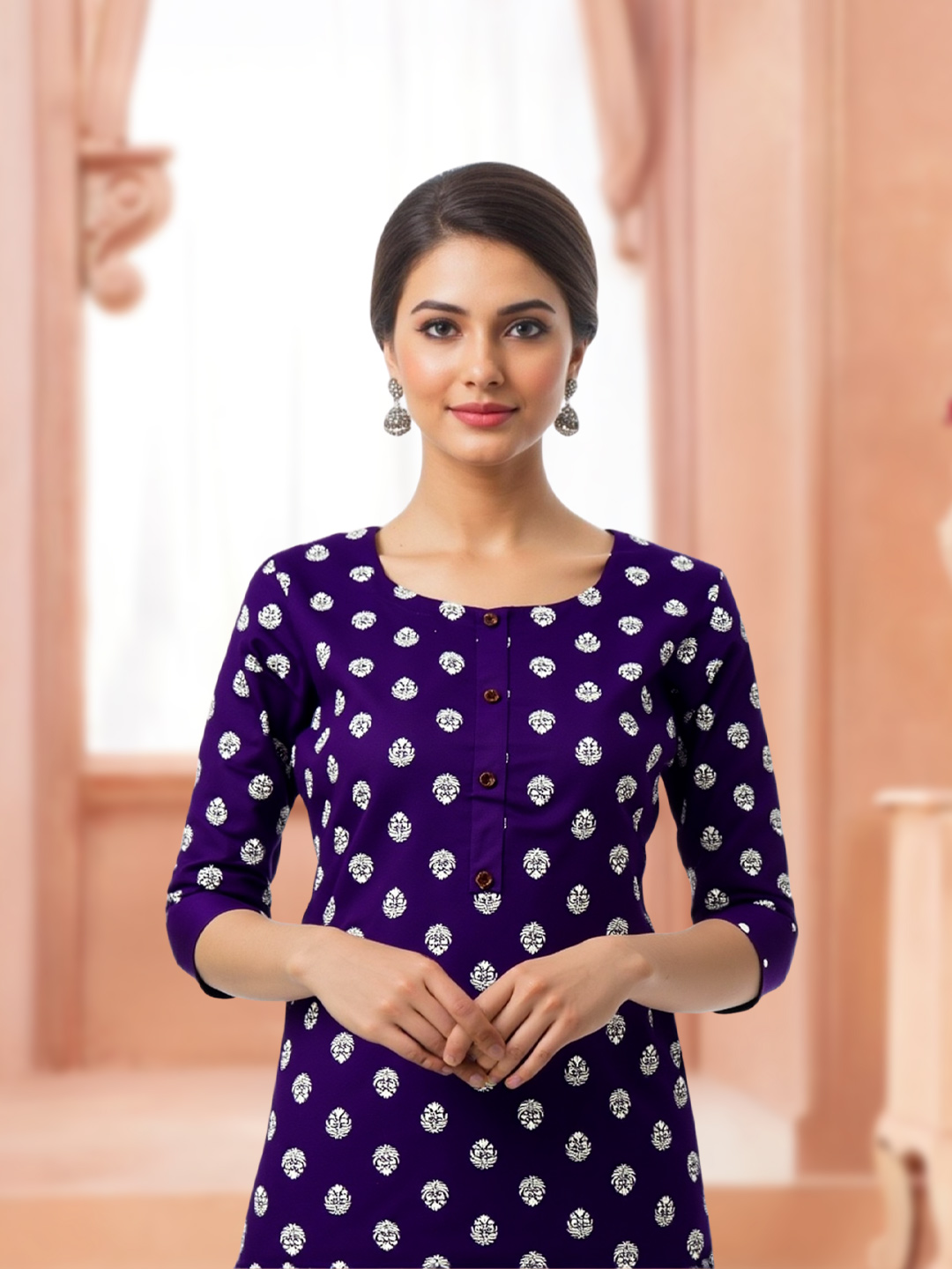 Designed with a graceful round neckline, this kurti is enhanced with delicate button detailing. The subtle accents elevate the overall look without overpowering the traditional print.