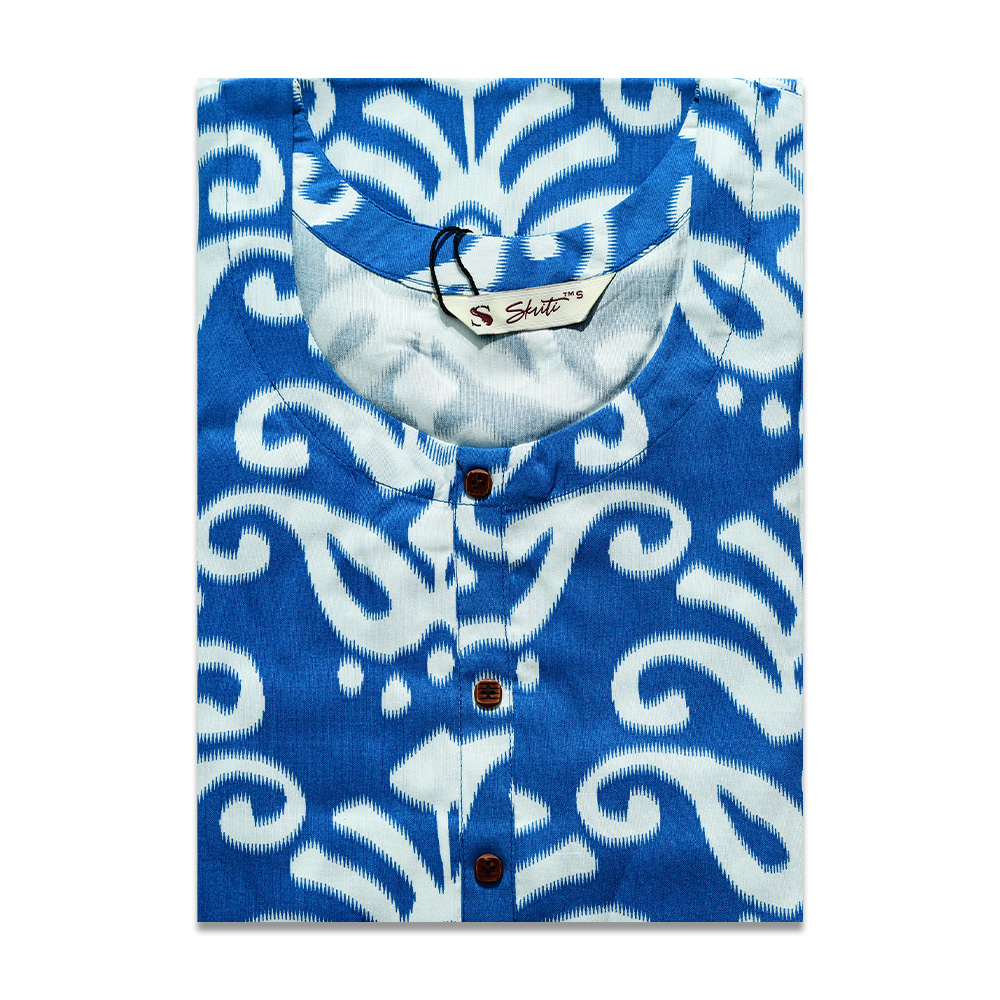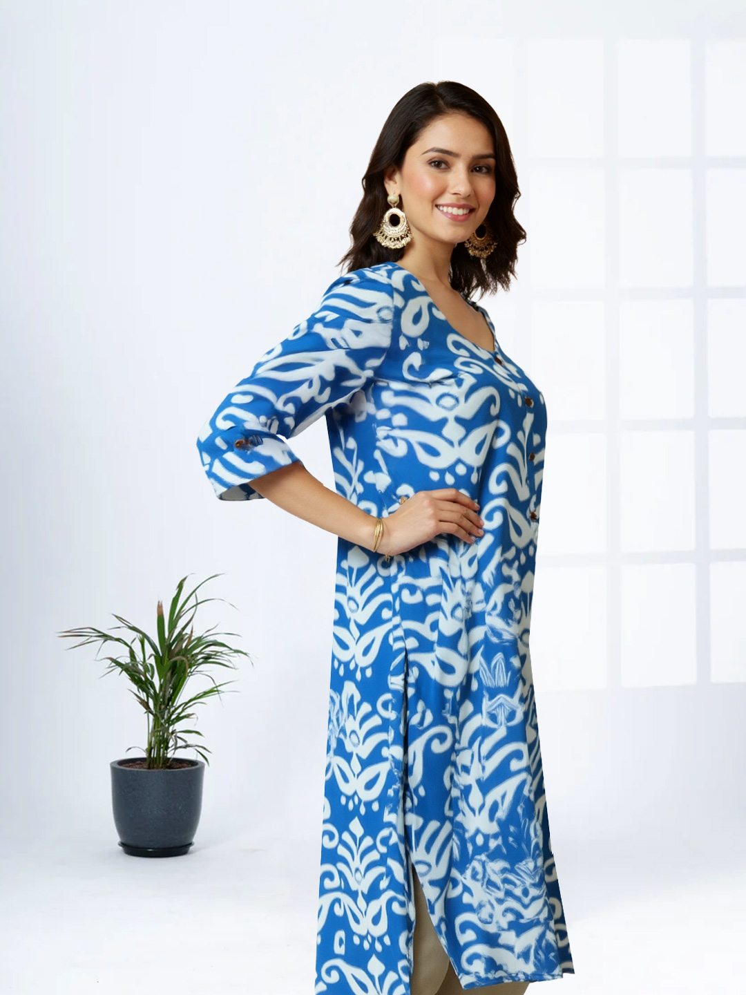 This straight kurta brings traditional motifs to life with a modern twist. The round neckline and 3/4 sleeves keep the look simple yet sophisticated, while the authentic print design gives it a rooted, earthy appeal. Ideal for day-to-day wear or cultural events.