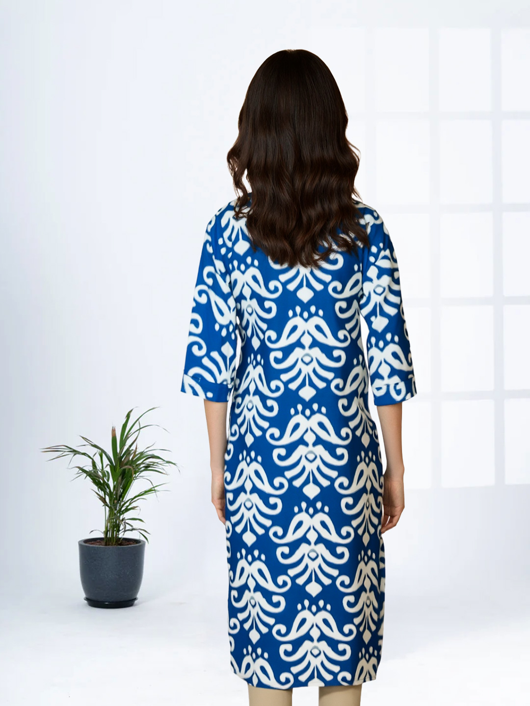 This Traditional Print Straight Kurta blends minimal design with cultural charm. The round neckline and 3/4 sleeves offer a neat, graceful appearance, while the intricate print adds depth and character. Pair it with leggings or pants for a refined ethnic look.