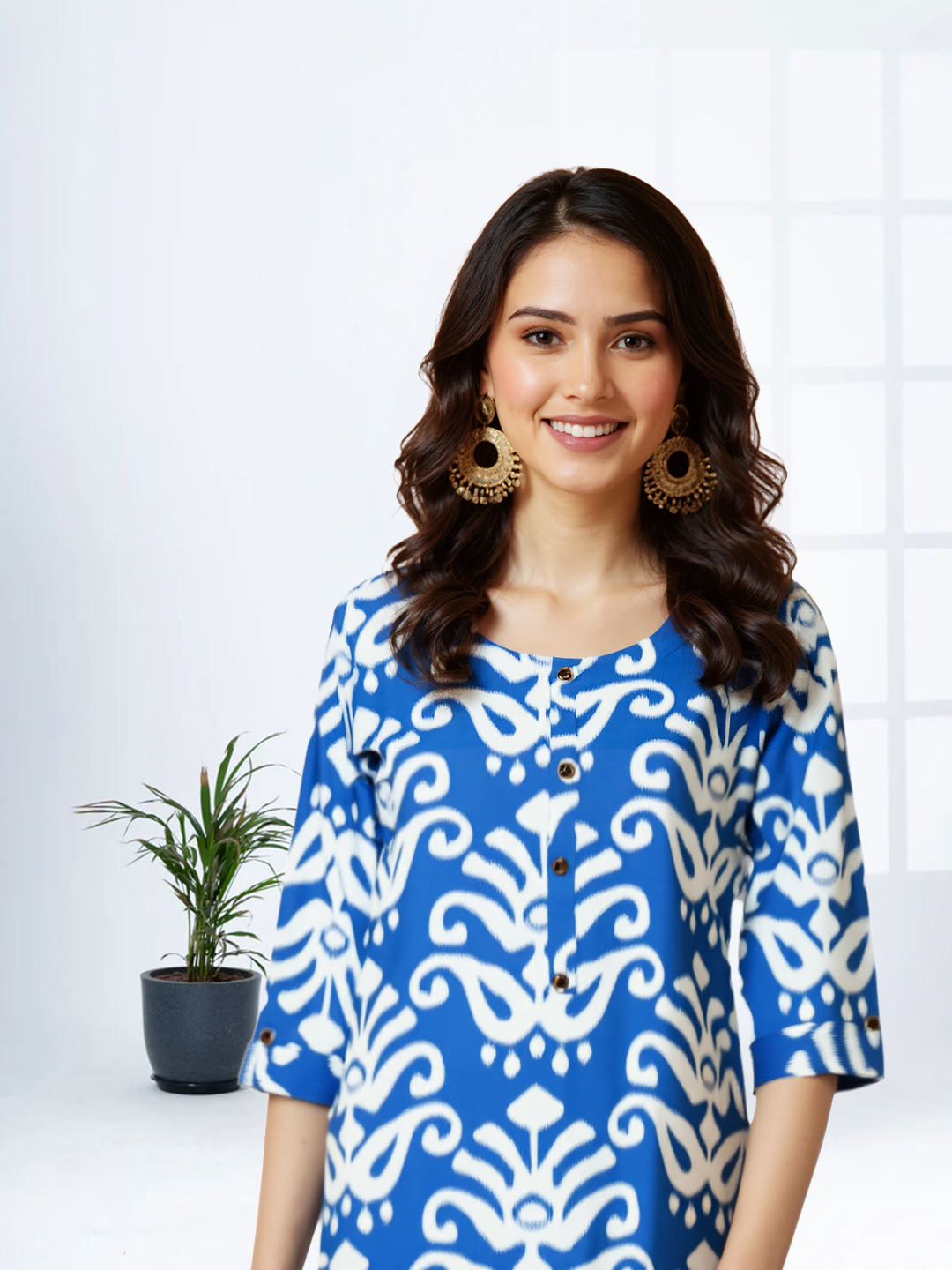 Whether you're dressing for comfort or style, this Traditional Print Kurta has you covered. With its round neck, 3/4 sleeves, and beautifully detailed prints, it effortlessly blends heritage with functionality—your perfect pick for understated elegance.