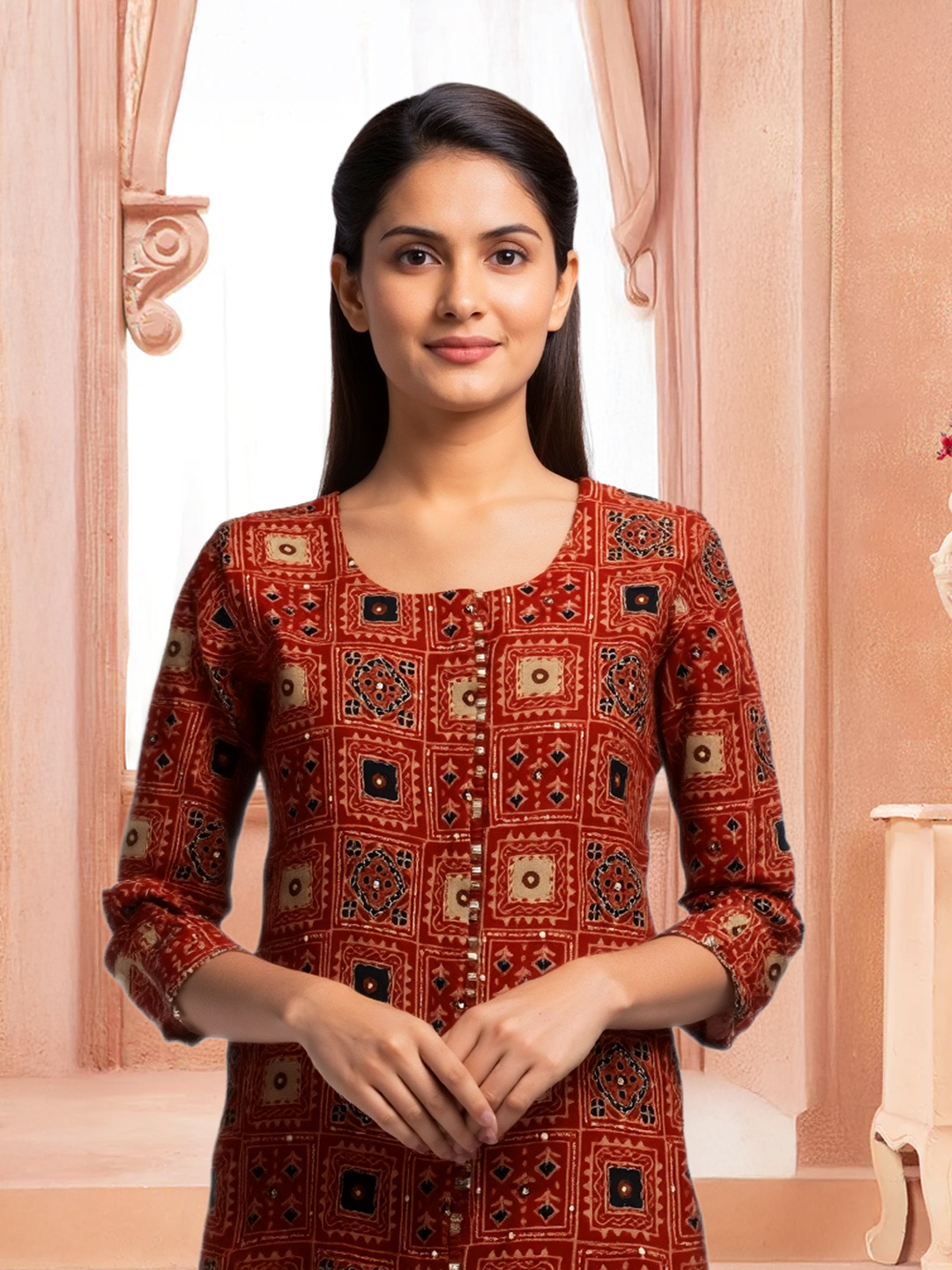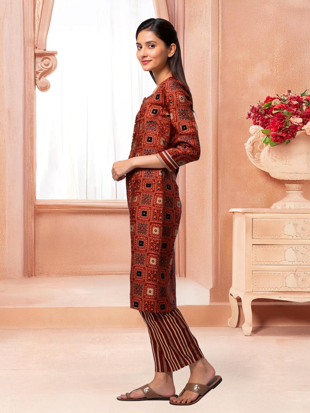 This Traditional Printed Kurta with Pant Set effortlessly combines style with comfort. The rich, intricate prints on the kurta capture the essence of tradition, while the matching straight pants create a sleek and modern silhouette. The 3/4 sleeves offer a flattering look, providing just the right amount of coverage. Made from premium quality fabric, this set ensures that you stay comfortable and stylish all day long, making it an ideal choice for both casual wear and festive occasions.