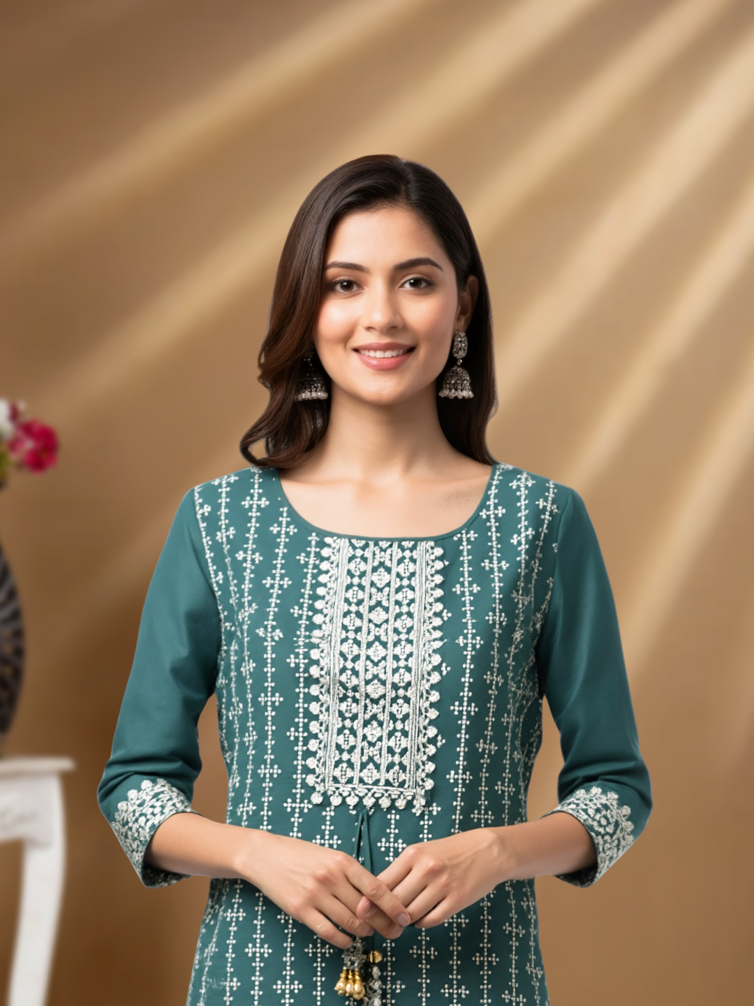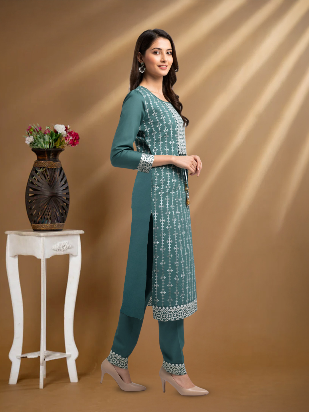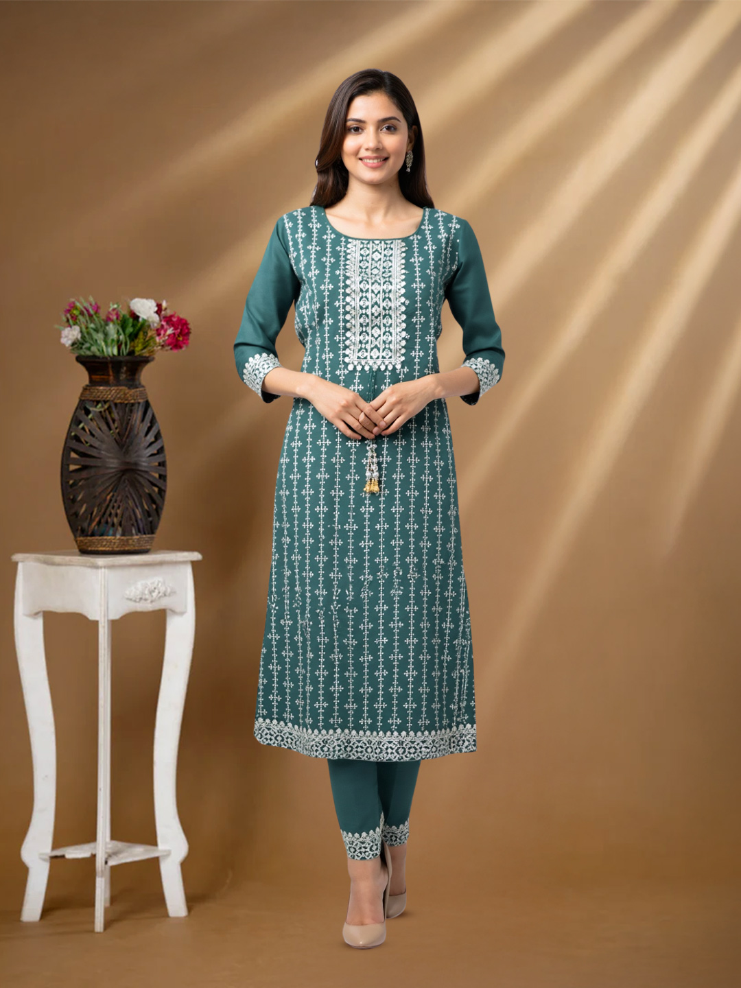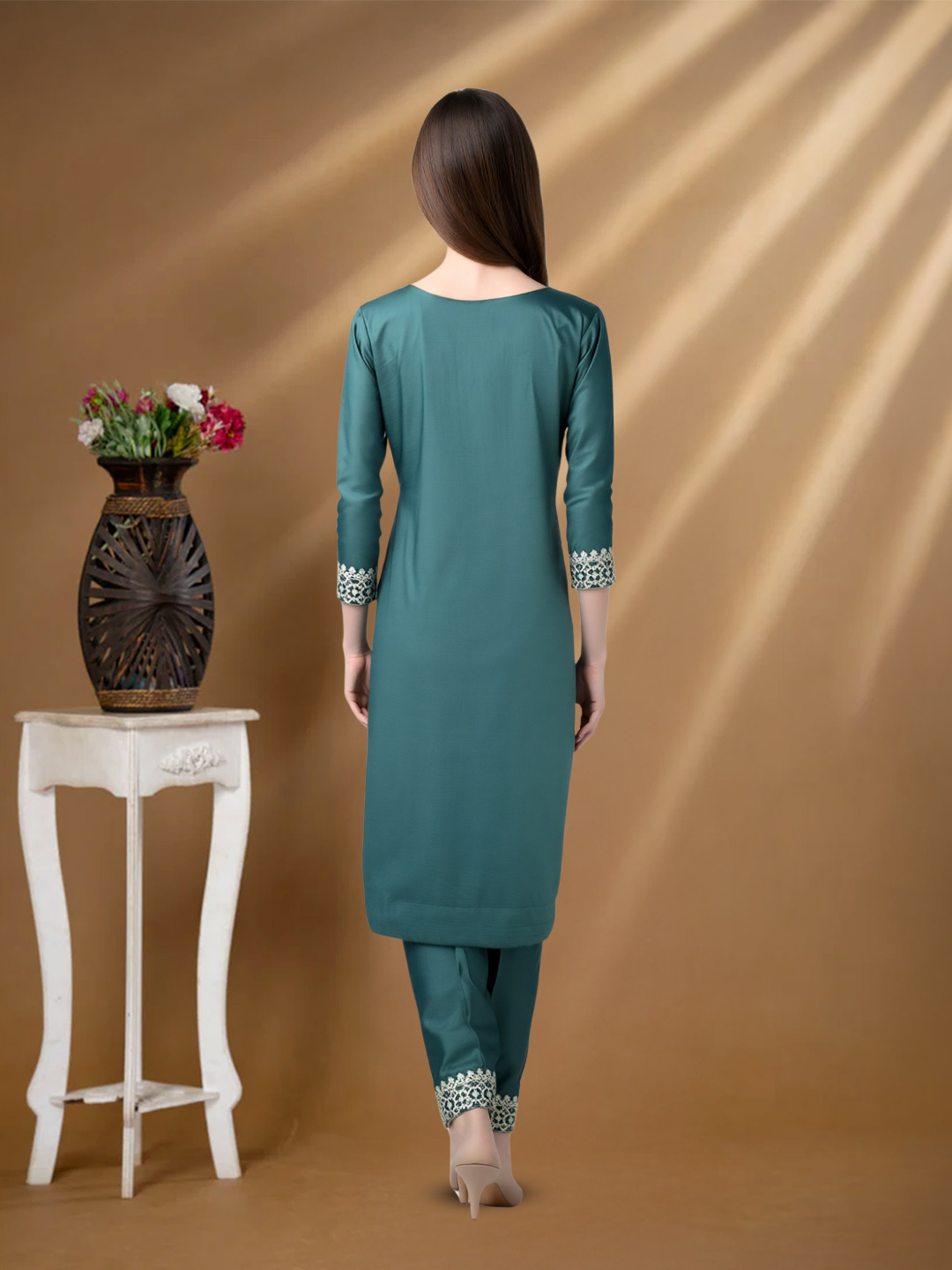 The straight-cut kurta paired with straight-fit pants creates a modern, flattering silhouette. While the fit feels contemporary, traditional design elements preserve the timeless charm of ethnic wear.