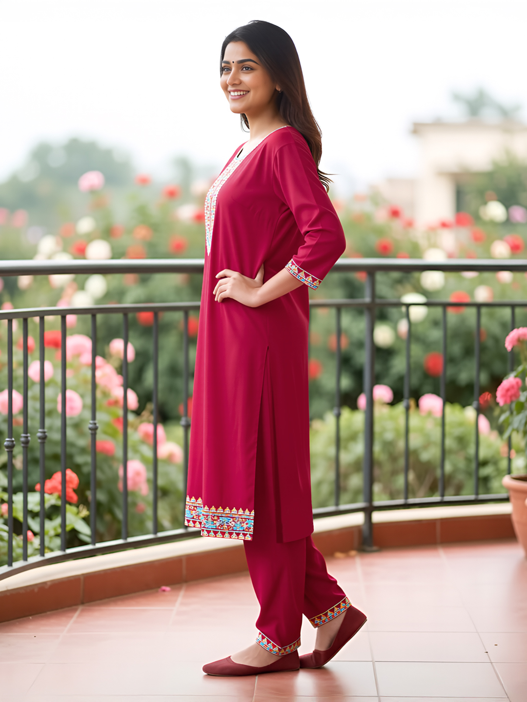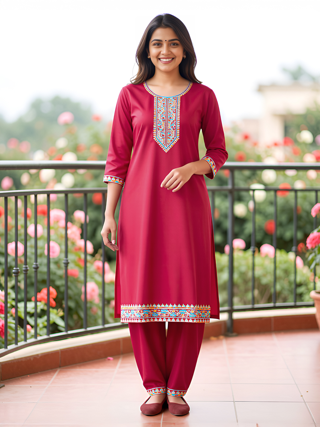 | Pant Type | Matching churidar pants with coordinated embroidery |