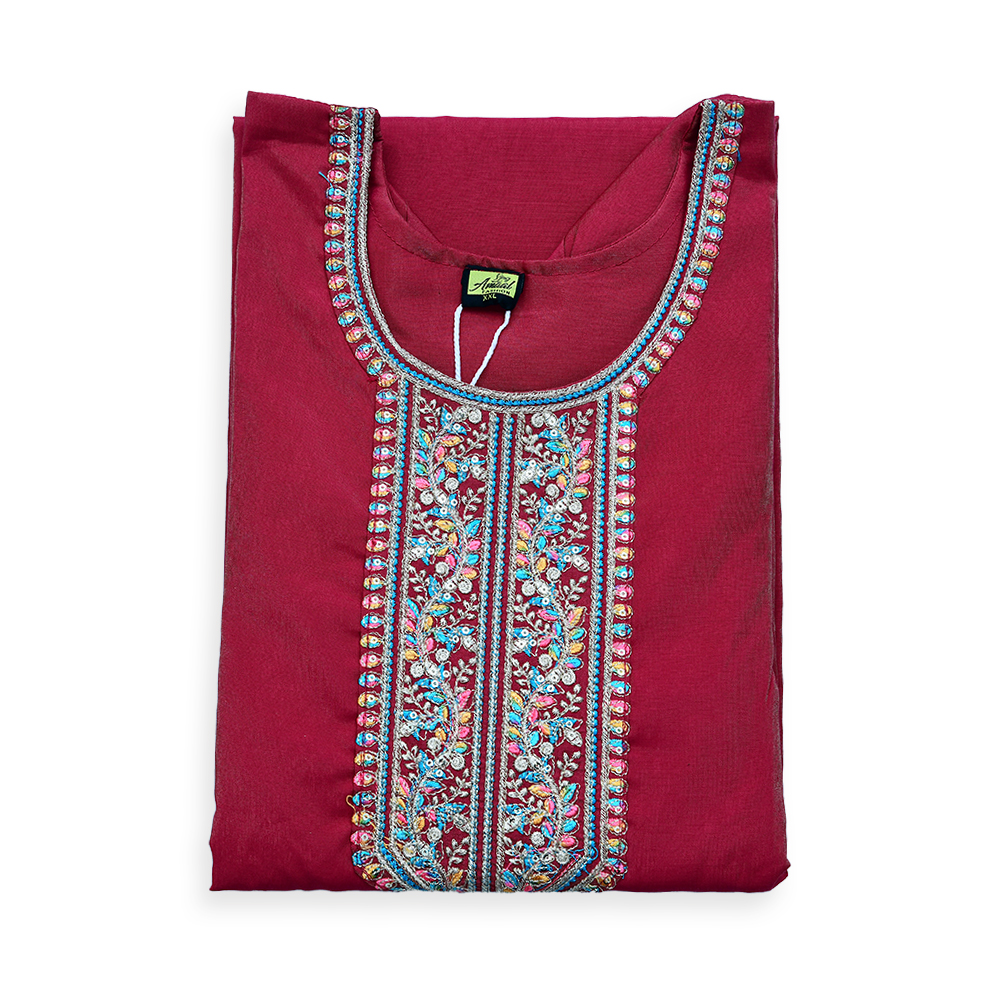 Indulge in the art of traditional craftsmanship with this Straight Cut Embroidery Salwar Suit Set. The round neckline is adorned with a vibrant multicolor embroidered panel that catches the eye, while the 3/4th sleeves with embroidered cuffs add a graceful, refined touch. The beautifully embroidered hemline and slim-fit churidar pants complete this elegant ensemble, making it perfect for festive occasions or evening soirees.