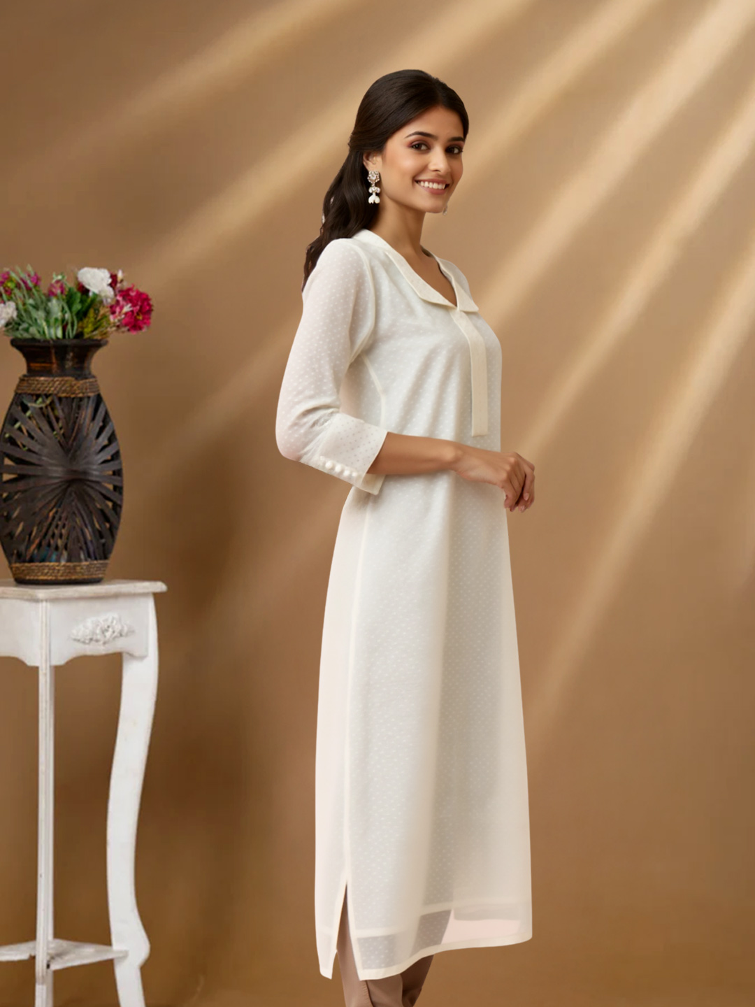 Step out in sophistication with this elegant kurti featuring a flattering V-collared neckline. Its graceful design is perfect for both casual and semi-formal occasions.