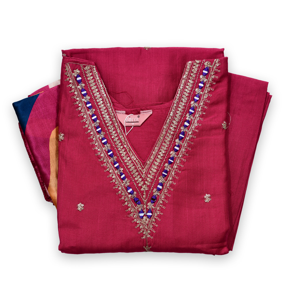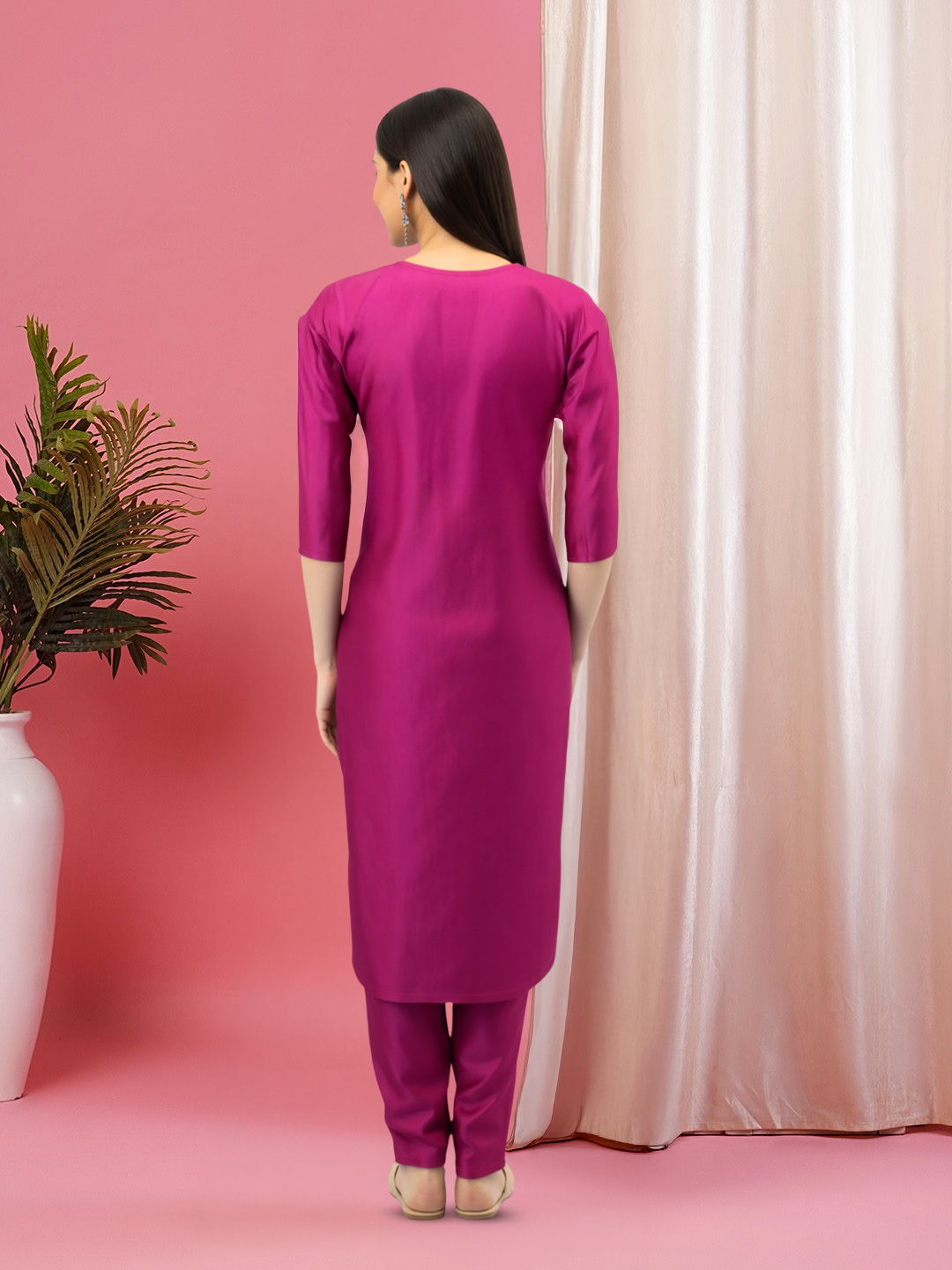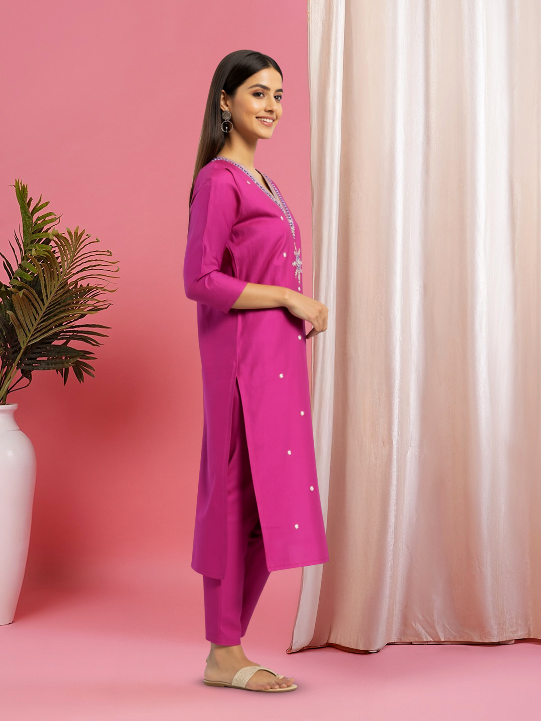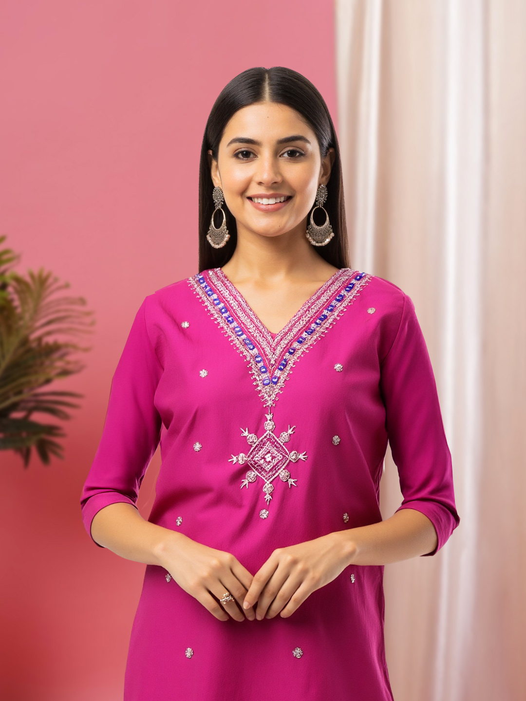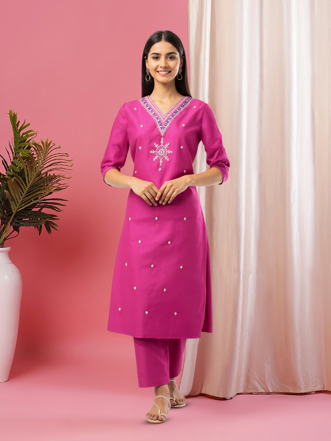 Experience modern ethnic fashion with this stunning kurta set designed for comfort and style. The deep V-neck embroidered neckline creates a captivating focal point, complemented by subtle scattered motifs across the kurta. The 3/4th sleeves and straight-cut silhouette ensure all-day ease. Finished with tailored pants and a lightweight, flowy multicolor dupatta, this outfit brings together class and color in harmony.
