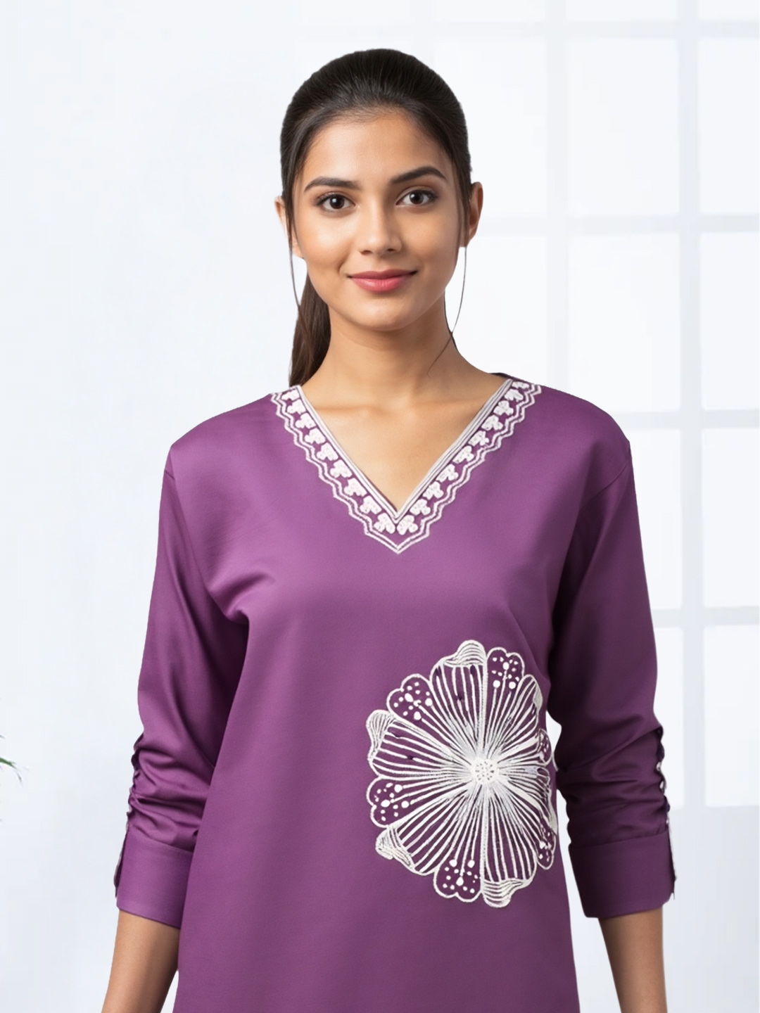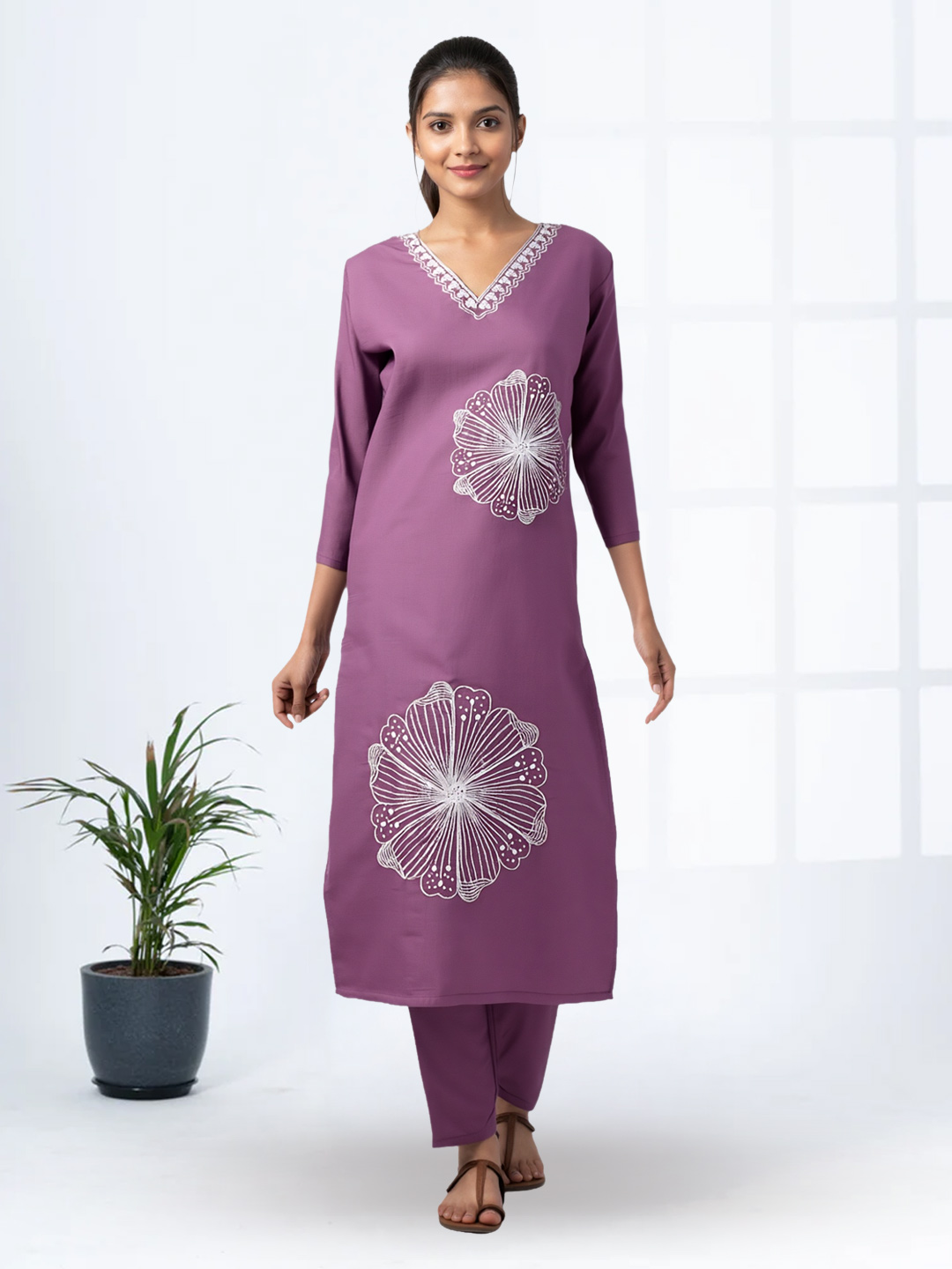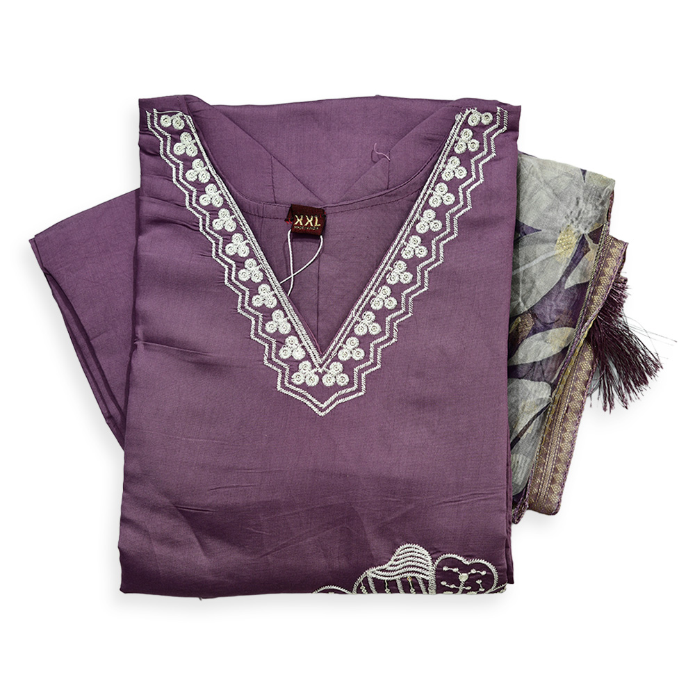 Step into effortless charm with this V-neck salwar suit adorned with delicate floral embroidery. The matching straight pants ensure a sleek silhouette, while the elegant dupatta completes the look. Crafted from premium-quality fabric, this set combines style, comfort, and sophistication.