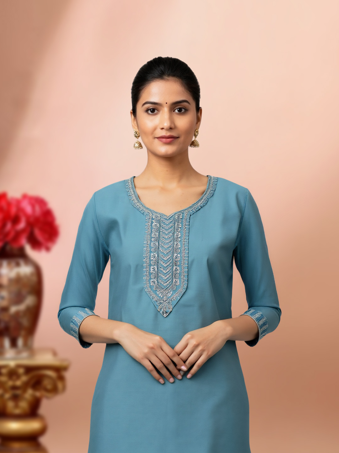 Indulge in the beauty of intricate threadwork embroidery that elevates the classic salwar suit to a whole new level. The V-slit round neckline is meticulously crafted with elegant detailing, adding a sophisticated charm to your traditional wardrobe. Perfect for weddings, festivals, or any special occasion, this design ensures you stand out with grace and poise.