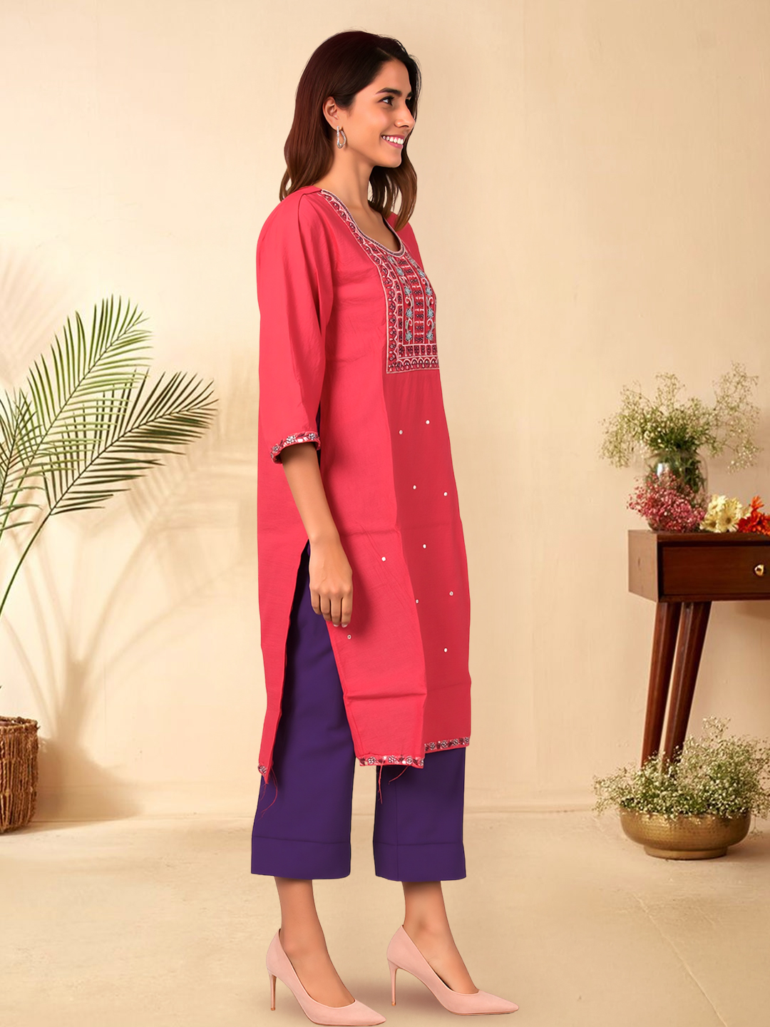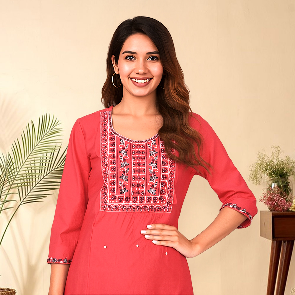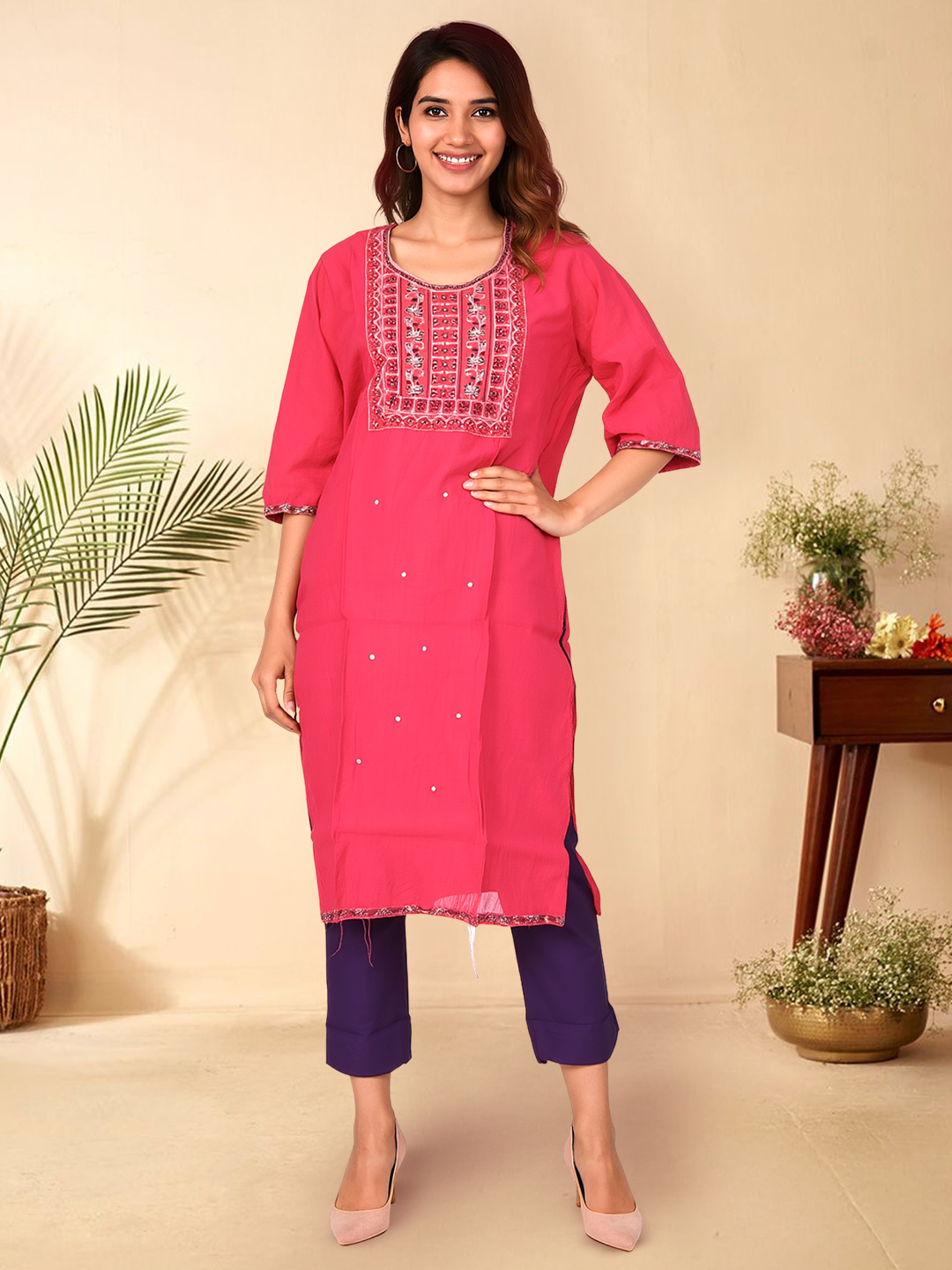 The kurta is adorned with vibrant embroidery along the neckline, featuring a stunning design in rich, lively hues. This detailed artwork adds a playful yet refined touch, making it a standout piece in your wardrobe.