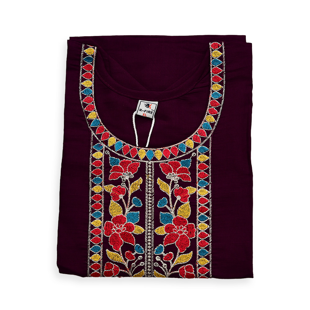 The rounded neckline featuring detailed embroidery adds a refined touch, enhancing the kurta’s classic and graceful appeal.