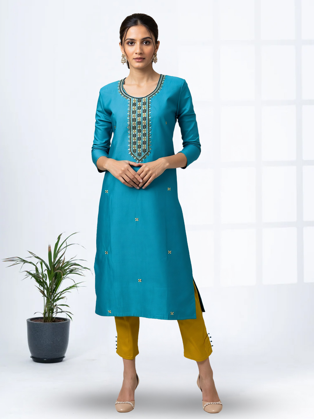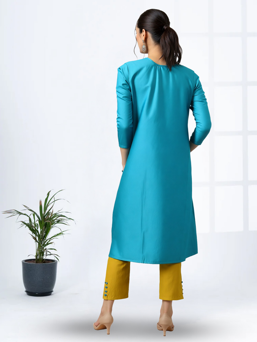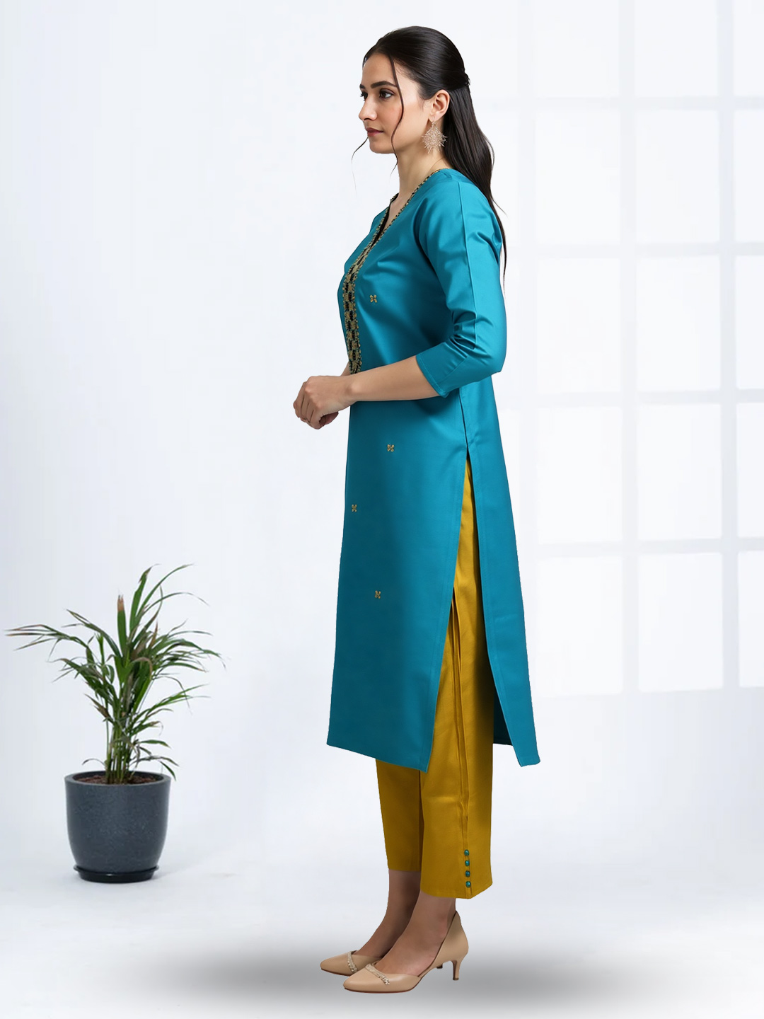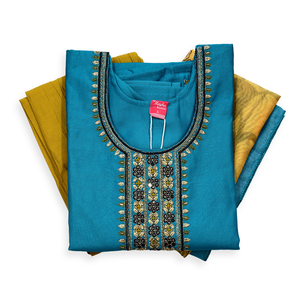 Embrace the beauty of floral elegance with this salwar suit set. The kurta's stunning embroidery detailing, paired with the graceful floral dupatta, creates a timeless and feminine look. The coordinated bottom complements the outfit perfectly, making it an ideal choice for any special occasion or gathering. This outfit exudes an air of refined charm and effortless elegance.