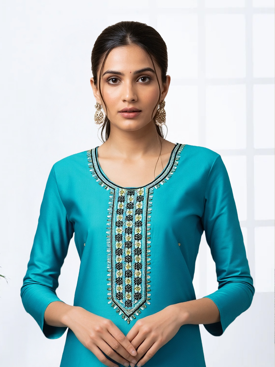 This stunning salwar suit set is a true work of art, featuring intricate embroidery detailing around the neckline and borders of the kurta. The elegant floral dupatta adds a graceful touch, with its delicate threadwork enhancing the overall design. Paired with a coordinated bottom, this set is a harmonious blend of traditional craftsmanship and modern sophistication—perfect for making a statement at any special occasion.