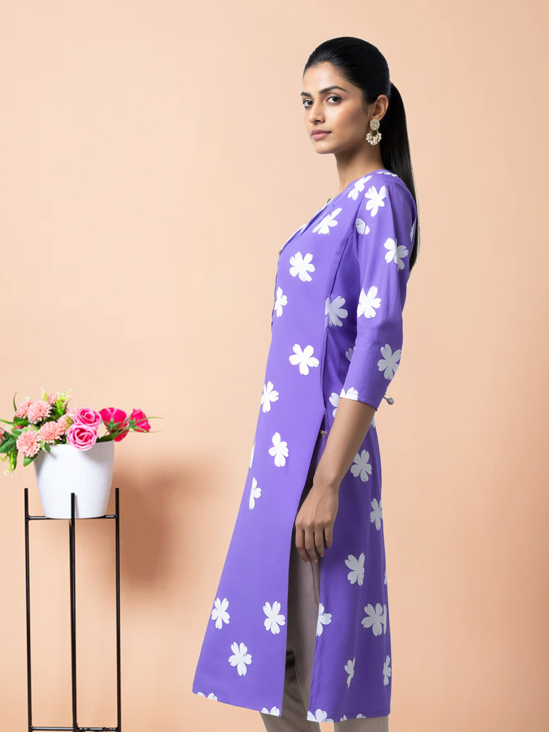 Add a splash of vibrance to your wardrobe with this Floral Printed Kurta. The eye-catching print brings an instant burst of freshness, while the flattering silhouette ensures comfort and style from morning to night. The elegant rounded neckline, adorned with delicate buttons, adds a sophisticated touch to this otherwise relaxed design. Perfect for any occasion, its stylish 3/4 sleeves provide just the right amount of airiness for sunny days.