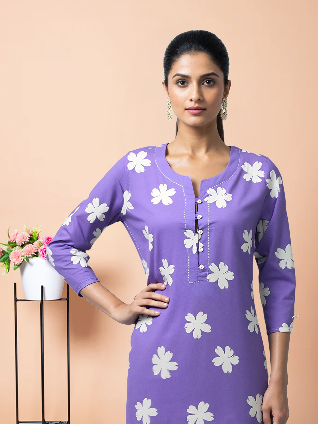 Step into the spotlight with this Vibrant Floral Printed Kurta. The lively floral design injects energy into your look, while the elegant rounded neckline with button detailing adds a sophisticated flair. Whether you're heading to a casual outing or a festive gathering, this kurta promises comfort and style. The 3/4 sleeves ensure you stay cool and comfortable throughout the day, making it a versatile wardrobe essential.