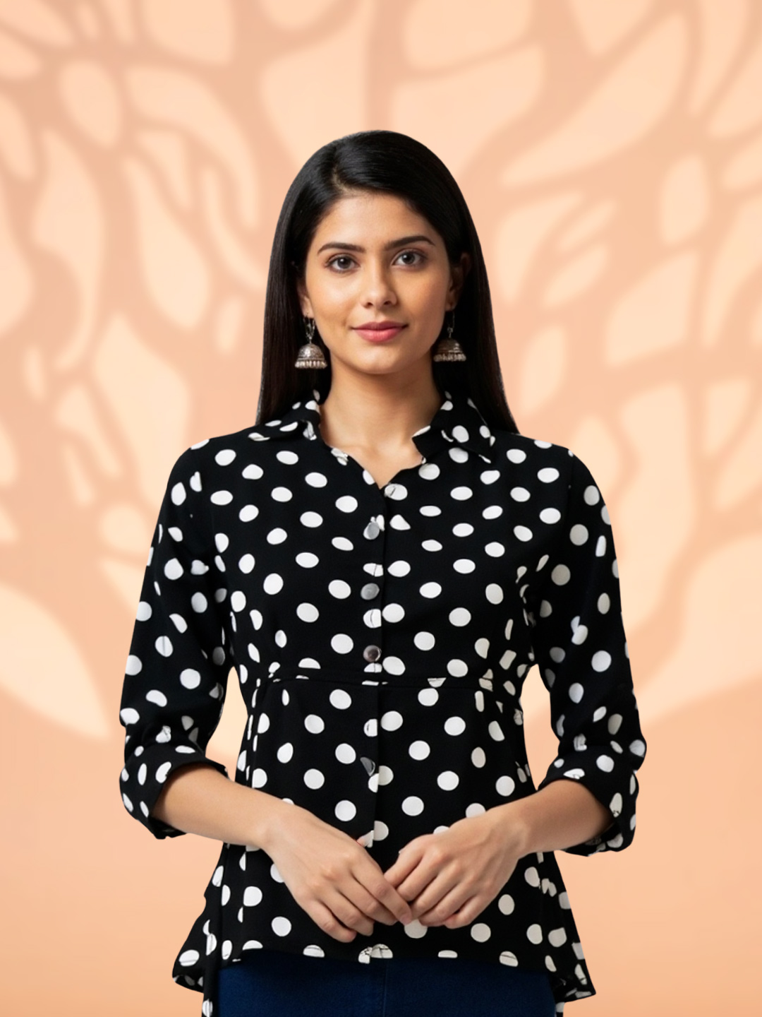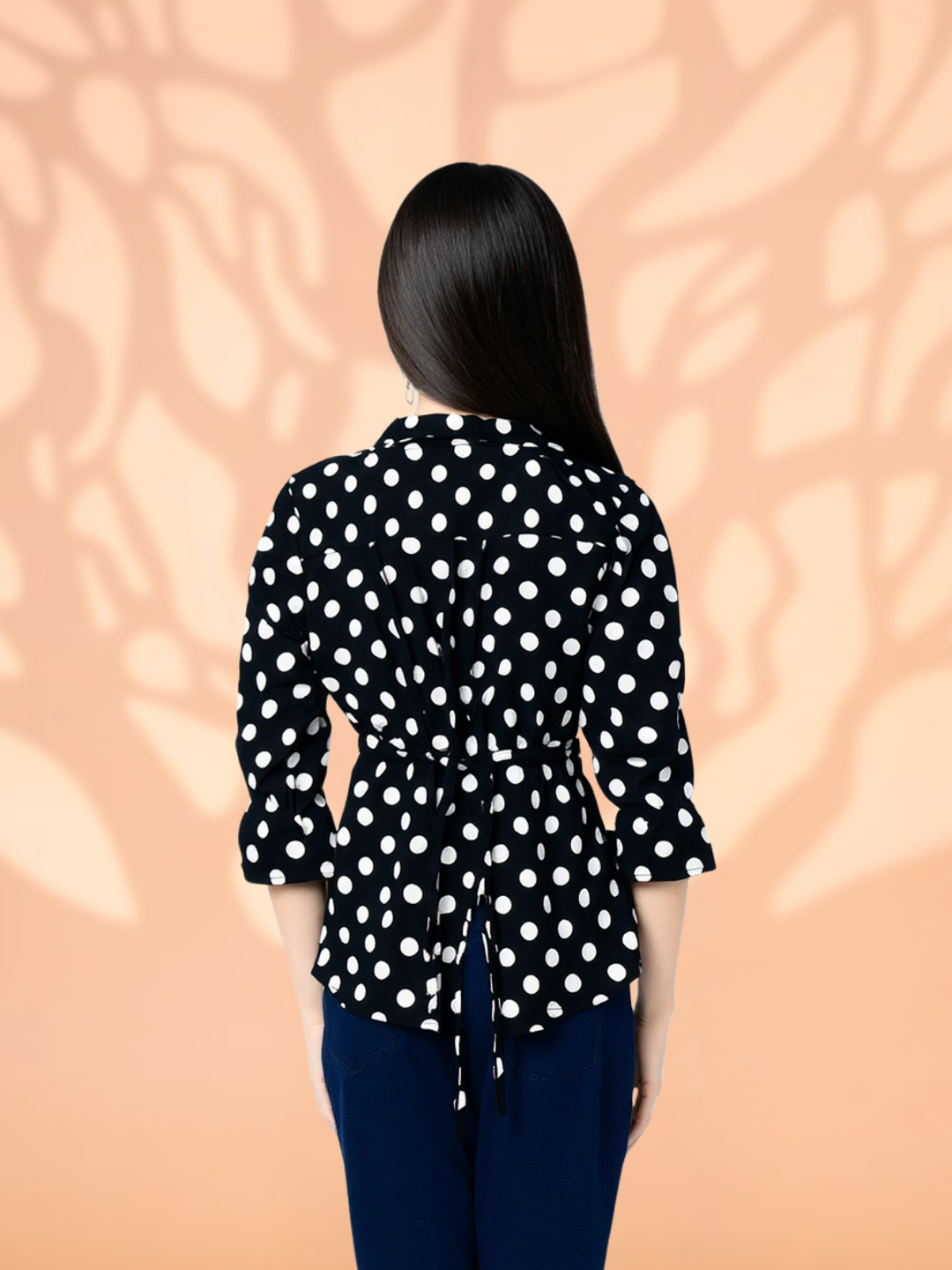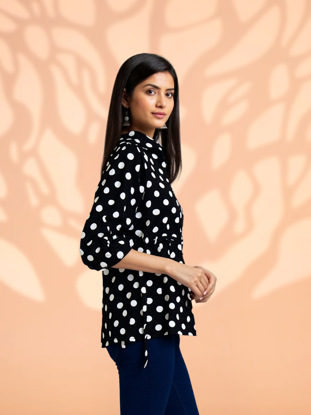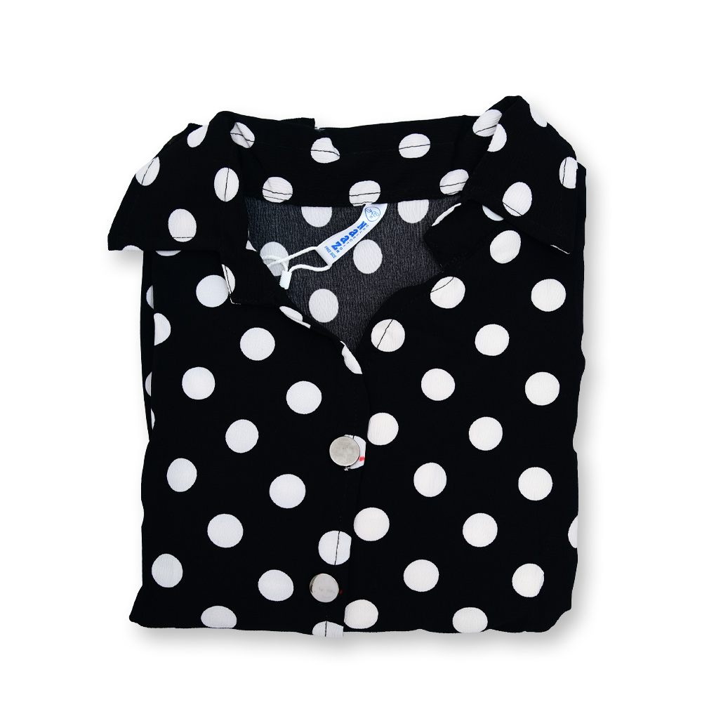 Featuring a classic black base adorned with crisp white polka dots, this top delivers a look that never goes out of style. The iconic print adds playful elegance while remaining effortlessly chic.